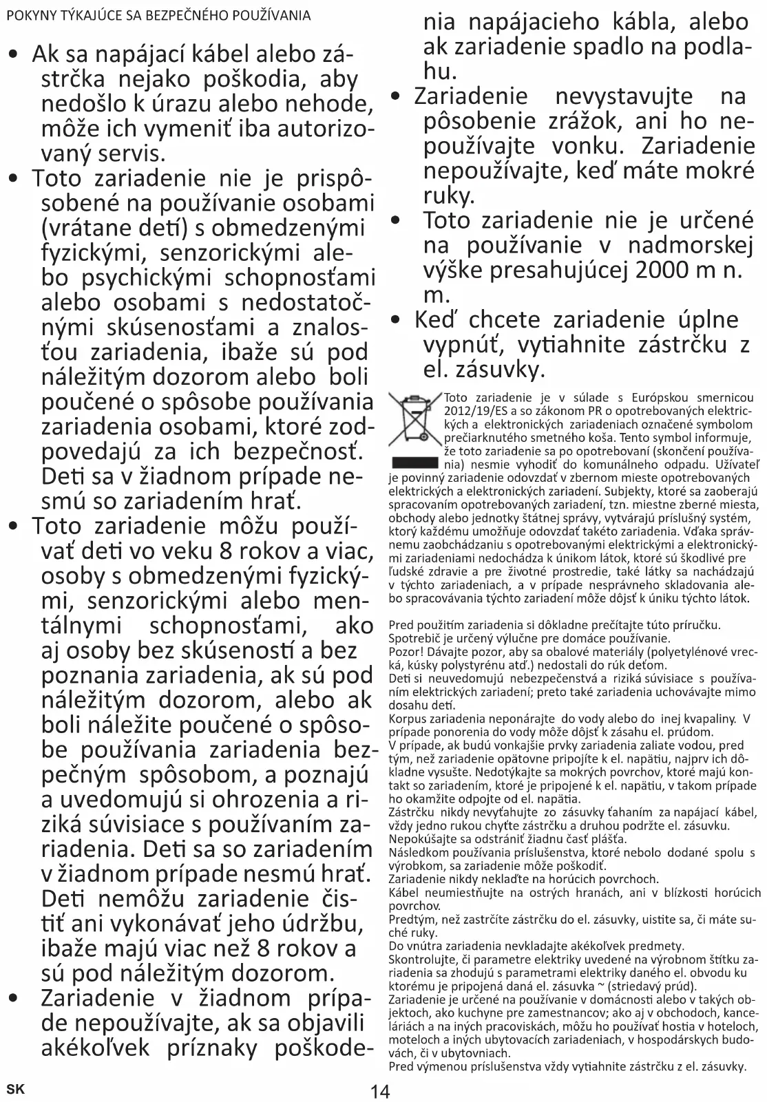 - Toto zariadenie môžu použí- vať de vo veku 8 rokov a viac, osoby s obmedzenými fyzický- mi, senzorickými alebo men- tálnymi schopnosťami, ako aj osoby bez skúsenos a bez poznania zariadenia, ak sú pod náležitým dozorom, alebo ak boli náležite poučené o spôso- be používania zariadenia bez- pečným spôsobom, a poznajú a uvedomujú si ohrozenia a ri- ziká súvisiace s používaním za- riadenia. De sa so zariadením v žiadnom prípade nesmú hrať. De nemôžu zariadenie čis- ť ani vykonávať jeho údržbu, ibaže majú viac než 8 rokov a sú pod náležitým dozorom.