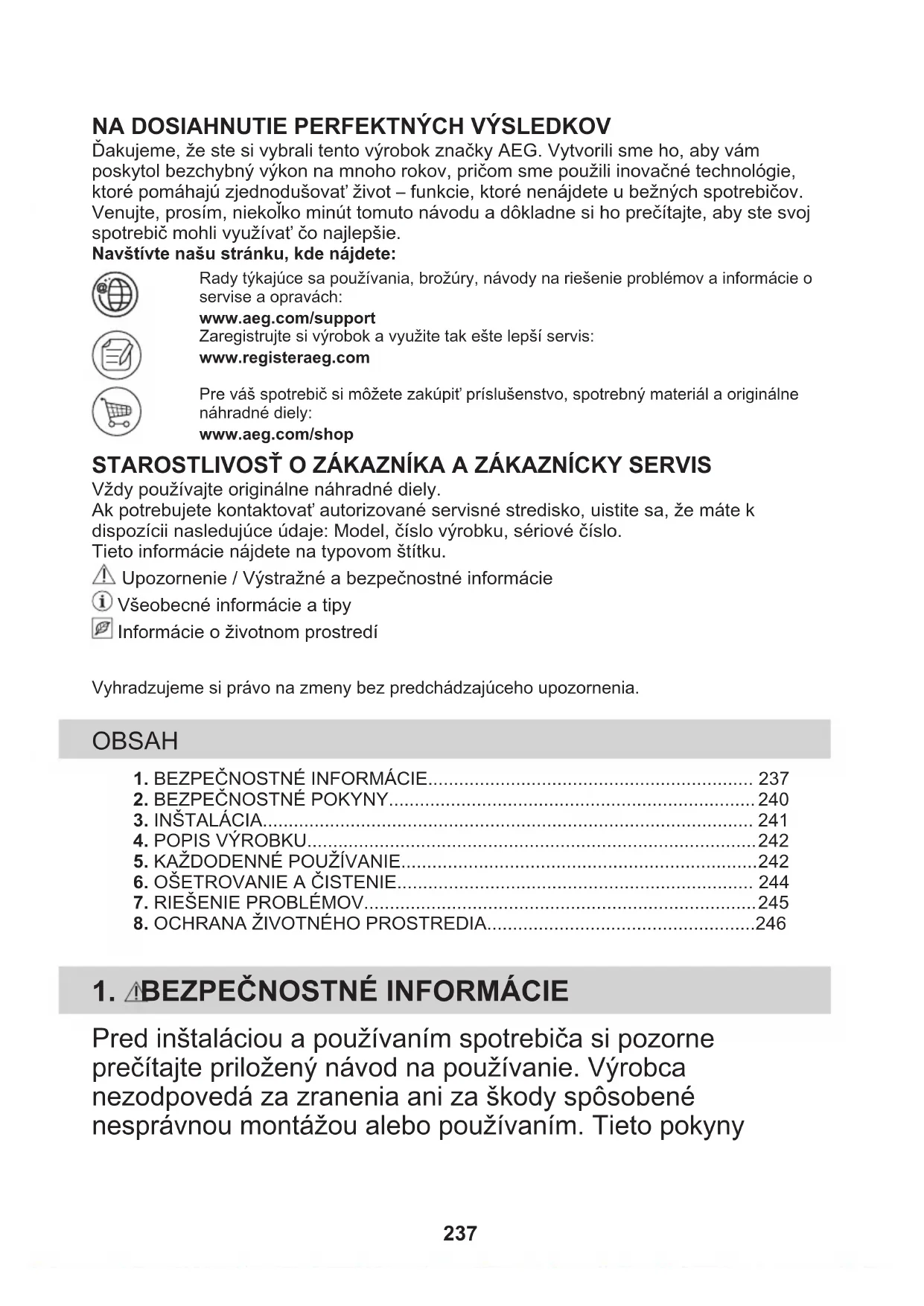 Ďakujeme, že ste si vybrali tento výrobok značky AEG. Vytvorili sme ho, aby vámposkytol bezchybný výkon na mnoho rokov, pričom sme použili inovačné technológie,ktoré pomáhajú zjednodušovať život – funkcie, ktoré nenájdete u bežných spotrebičov.Venujte, prosím, niekoľko minút tomuto návodu a dôkladne si ho prečítajte, aby ste svojspotrebič mohli využívať čo najlepšie.Navštívte našu stránku, kde nájdete:Rady týkajúce sa používania, brožúry, návody na riešenie problémov a informácie oservise a opravách:www.aeg.com/supportZaregistrujte si výrobok a využite tak ešte lepší servis:www.registeraeg.comPre váš spotrebič si môžete zakúpiť príslušenstvo, spotrebný materiál a originálnenáhradné diely:www.aeg.com/shop STAROSTLIVOSŤ O ZÁKAZNÍKA A ZÁKAZNÍCKY SERVIS Vždy používajte originálne náhradné diely.Ak potrebujete kontaktovať autorizované servisné stredisko, uistite sa, že máte kdispozícii nasledujúce údaje: Model, číslo výrobku, sériové číslo.Tieto informácie nájdete na typovom štítku. Upozornenie / Výstražné a bezpečnostné informácie Všeobecné informácie a tipy Informácie o životnom prostredíVyhradzujeme si právo na zmeny bez predchádzajúceho upozornenia. OBSAH