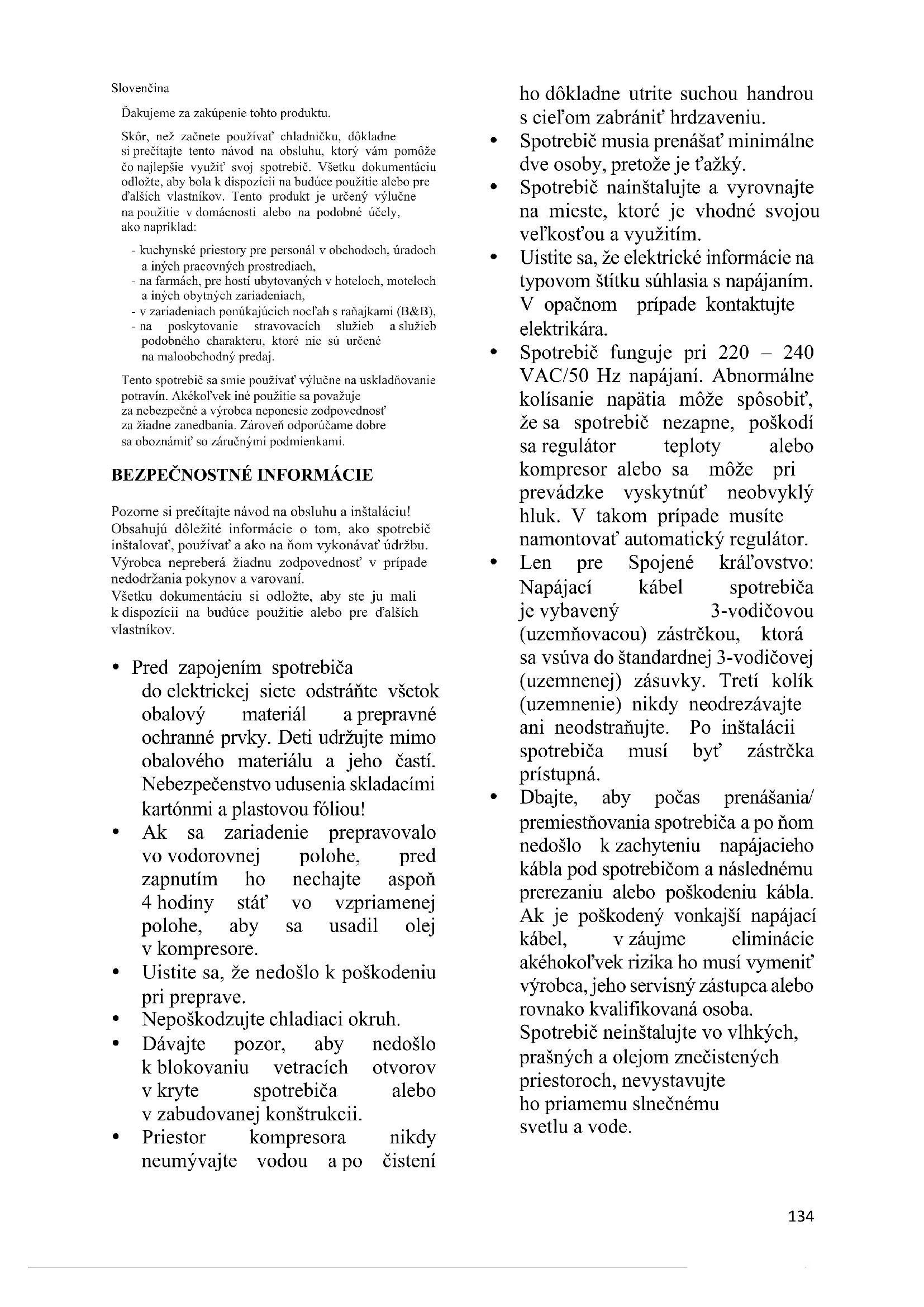 Pozorne si prečítajte návod na obsluhu a inštaláciu! Obsahujú dôležité informácie o tom, ako spotrebič inštalovať, používať a ako na ňom vykonávať údržbu. Výrobca nepreberá žiadnu zodpovednosť v prípade nedodržania pokynov a varovaní. Všetku dokumentáciu si odložte, aby ste ju mali k dispozícii na budúce použitie alebo pre ďalších vlastníkov. Pred zapojením spotrebiča do elektrickej siete odstráňte všetok obalový materiál a prepravné ochranné prvky. Deti udržujte mimo obalového materiálu a jeho častí. Nebezpečenstvo udusenia skladacími kartónmi a plastovou fóliou! Ak sa zariadenie prepravovalo vo vodorovnej polohe, pred zapnutím ho nechajte aspoň 4 hodiny stáť vo vzpriamenej polohe, aby sa usadil olej v kompresore. Uistite sa, že nedošlo k poškodeniu pri preprave. Nepoškodzujte chladiaci okruh. Dávajte pozor, aby nedošlo k blokovaniu vetracích otvorov v kryte spotrebiča alebo v zabudovanej konštrukcii. Priestor kompresora nikdy neumývajte vodou a po čistení ho dôkladne utrite suchou handrou s cieľom zabrániť hrdzaveniu. Spotrebič musia prenášať minimálne dve osoby, pretože je ťažký. Spotrebič nainštalujte a vyrovnajte na mieste, ktoré je vhodné svojou veľkosťou a využitím. Uistite sa, že elektrické informácie na typovom štítku súhlasia s napájaním. V opačnom prípade kontaktujte elektrikára. Spotrebič funguje pri 220 – 240 VAC/50 Hz napájaní. Abnormálne kolísanie napätia môže spôsobiť, že sa spotrebič nezapne, poškodí sa regulátor teploty alebo kompresor alebo sa môže pri prevádzke vyskytnúť neobvyklý hluk. V takom prípade musíte namontovať automatický regulátor. Len pre Spojené kráľovstvo: Napájací kábel spotrebiča je vybavený 3-vodičovou (uzemňovacou) zástrčkou, ktorá sa vsúva do štandardnej 3-vodičovej (uzemnenej) zásuvky. Tretí kolík (uzemnenie) nikdy neodrezávajte ani neodstraňujte. Po inštalácii spotrebiča musí byť zástrčka prístupná. Dbajte, aby počas prenášania/ premiestňovania spotrebiča a po ňom nedošlo k zachyteniu napájacieho kábla pod spotrebičom a následnému prerezaniu alebo poškodeniu kábla. Ak je poškodený vonkajší napájací kábel, v záujme eliminácie akéhokoľvek rizika ho musí vymeniť výrobca, jeho servisný zástupca alebo rovnako kvalifikovaná osoba. Spotrebič neinštalujte vo vlhkých, prašných a olejom znečistených priestoroch, nevystavujte ho priamemu slnečnému svetlu a vode.135 Spotrebič neinštalujte do blízkosti ohrievačov ani horľavých materiálov. PRE spotrebiče s mraziacim boxom: v prípade výpadku prúdu neotvárajte veko. Ak bude porucha pretrvávať kratšie, než je uvedené na typovom štítku (čas zvyšovania teploty), nemalo by to mať na zmrazené potraviny žiadny vplyv. V prípade dlhšieho výpadku treba potraviny skontrolovať a okamžite skonzumovať, prípadne tepelne upraviť a následne znova zmraziť. Ak sa vám zdá, že sa veko spotrebiča bezprostredne po zatvorení otvára veľmi ťažko, nie je to dôvod na obavu. Je to spôsobené rozdielom tlaku, ktorý sa po niekoľkých minútach vyrovná, takže sa veko bude dať znova normálne otvoriť. V spotrebiči neskladujte lieky, baktérie ani chemické látky. Toto zariadenie je domáci spotrebič. Neodporúčame vám, aby ste v ňom skladovali materiály, ktoré vyžadujú presné teploty. Napájací kábel neťahajte príliš veľkou silou ani ho neskrúcajte, zástrčky sa nedotýkajte mokrými rukami. V spotrebiči neskladujte produkty, ktoré obsahujú horľavé hnacie plyny (napr. spreje) alebo výbušné látky. Nebezpečenstvo výbuchu! Na chladničku neumiestňujte nestabilné predmety (ťažké predmety, nádoby naplnené vodou), aby nedošlo k zraneniu osôb následkom pádu alebo úrazu elektrickým prúdom po kontakte s vodou. Vnútri priestorov, ktoré slúžia na skladovanie potravín, nepoužívajte elektrické spotrebiče, pokiaľ ich používanie neschválil výrobca. Nedotýkajte sa vnútorných chladiacich prvkov, predovšetkým mokrými rukami, aby ste sa vyhli popraskaniu alebo zraneniam. Ohrozené sú deti, osoby so zníženými fyzickými, mentálnymi alebo duševnými schopnosťami, ako aj osoby, ktoré nemajú dostatočné vedomosti o bezpečnej prevádzke spotrebiča. Uistite sa, že deti a zraniteľné osoby chápu nebezpečenstvá. Osoba zodpovedná za bezpečnosť musí dohliadať alebo inštruovať deti a zraniteľné osoby, ktoré používajú spotrebič. Spotrebič môžu používať iba deti staršie ako 8 rokov. Deti sa so spotrebičom nesmú hrať. Deti vo veku od 3 do 8 rokov môžu chladničky nakladať a vykladať z nich potraviny. PRE spotrebiče s mraziacim boxom: v mraziacom boxe neskladujte kvapaliny vo fľašiach alebo plechovkách (najmä sýtené nápoje). Fľaše a plechovky môže roztrhnúť! PRE spotrebiče s mraziacim boxom: mrazené potraviny vybrané priamo z mraziaceho boxu si nikdy nedávajte do úst. Nebezpečenstvo omrzlín! Plastové diely a tesnenie dverí udržujte bez oleja a mastnoty. V opačnom prípade budú plastové časti a tesnenie dverí priepustné. Pred začatím vykonávania akejkoľvek činnosti vytiahnite napájací kábel z elektrickej zásuvky.136 Na urýchlenie odmrazovania nepoužívajte mechanické nástroje ani iné prostriedky s výnimkou tých, ktoré odporúča výrobca. Na odstraňovanie námrazy nepoužívajte špicaté predmety ani predmety s ostrými hranami, ako napríklad nože alebo vidličky. Na odmrazovanie nikdy nepoužívajte sušiče vlasov, elektrické ohrievače alebo podobné elektrické spotrebiče. Odporúčame dbať na čistotu zástrčky, prípadné usadeniny prachu na zástrčke môžu zapríčiniť vznik požiaru. Spotrebič sa nepokúšajte sami opravovať, rozoberať alebo upravovať. V prípade opravy vždy kontaktujte náš zákaznícky servis. Počas čistenia alebo údržby spotrebi