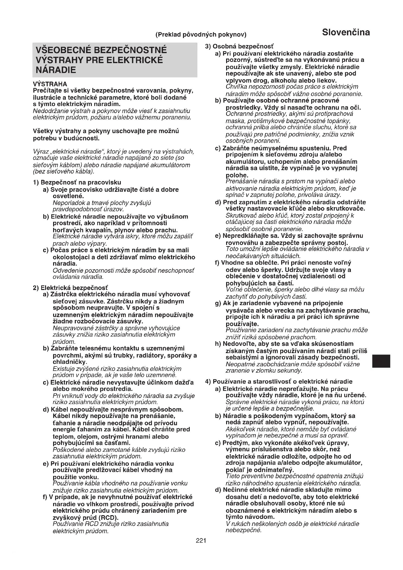 NÁRADIE VÝSTRAHA Prečítajte si všetky bezpečnostné varovania, pokyny, ilustrácie atechnické parametre, ktoré boli dodané stýmto elektrickým náradím. Nedodržanie výstrah a pokynov môže viesť k zasiahnutiu elektrickým prúdom, požiaru a/alebo vážnemu poraneniu. Všetky výstrahy a pokyny uschovajte pre možnú potrebu v budúcnosti. Výraz „elektrické náradie“, ktorý je uvedený na výstrahách, označuje vaše elektrické náradie napájané zo siete (so sieťovým káblom) alebo náradie napájané akumulátorom (bez sieťového kábla).