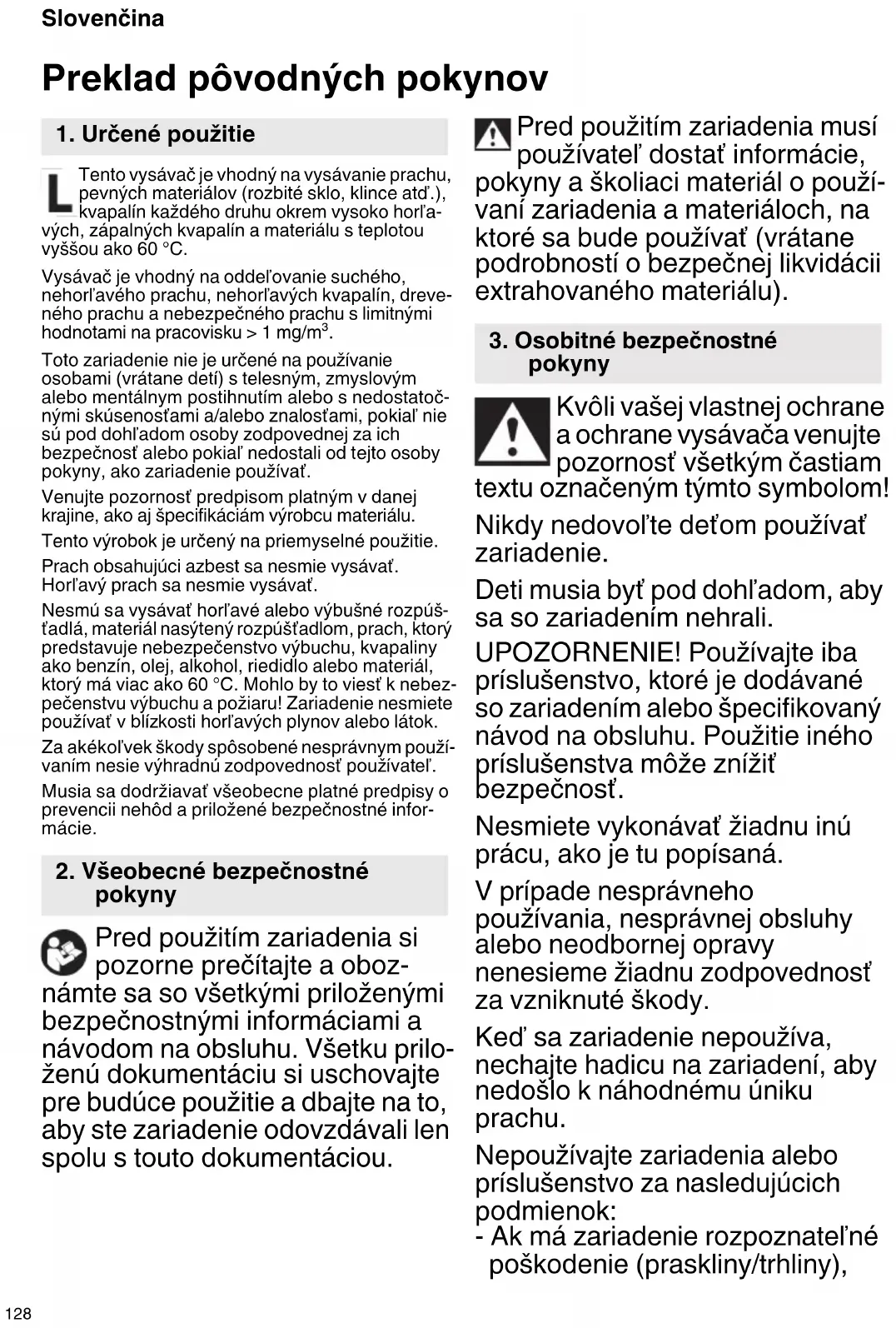 Pred vykonávaním akejkoľvek údržby vždy vypnite zariadenie a vytiahnite sieťovú zástrčku. Vyčistite zariadenie (pozrite časť 11.). Čo sa týka používateľskej údržby, vysávač sa musí rozobrať, vyčistiť a musí sa na ňom vykonať údržba do maximálne možnej miery bez ohrozenia perso- nálu údržby či iných ľudí. Preventívne opatrenia Medzi náležité preventívne opatrenia patria: vyčis- tenie zariadenia pred rozobratím; zabezpečenie miestneho filtrovaného tlakového vetrania pri rozo- bratom vysávači; vyčistenie oblasti údržby a zabez- pečenie vhodného osobného ochranného odevu a osobných ochranných prostriedkov.