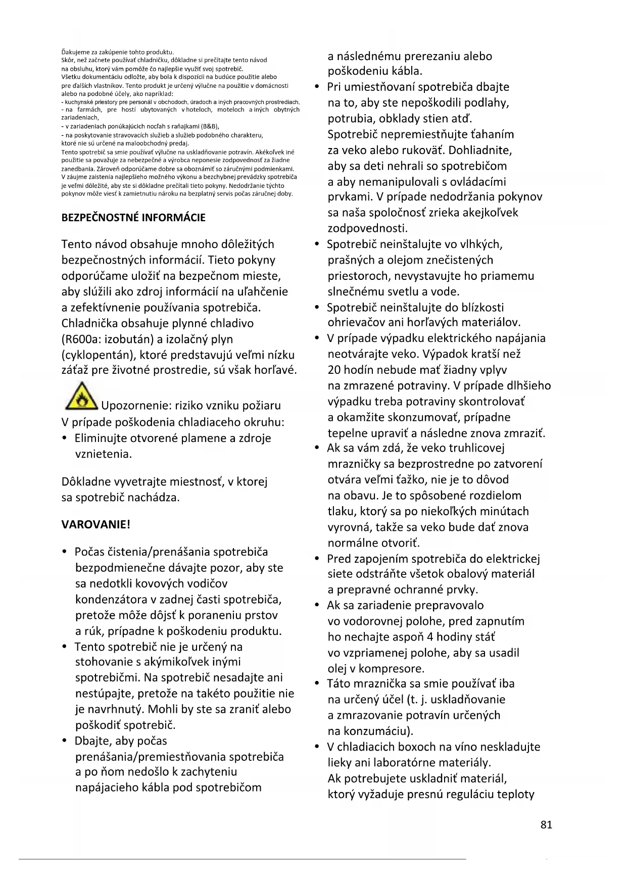 Tento návod obsahuje mnoho dôležitých bezpečnostných informácií. Tieto pokyny odporúčame uložiť na bezpečnom mieste, aby slúžili ako zdroj informácií na uľahčenie a zefektívnenie používania spotrebiča. Chladnička obsahuje plynné chladivo (R600a: izobután) a izolačný plyn (cyklopentán), ktoré predstavujú veľmi nízku záťaž pre životné prostredie, sú však horľavé.