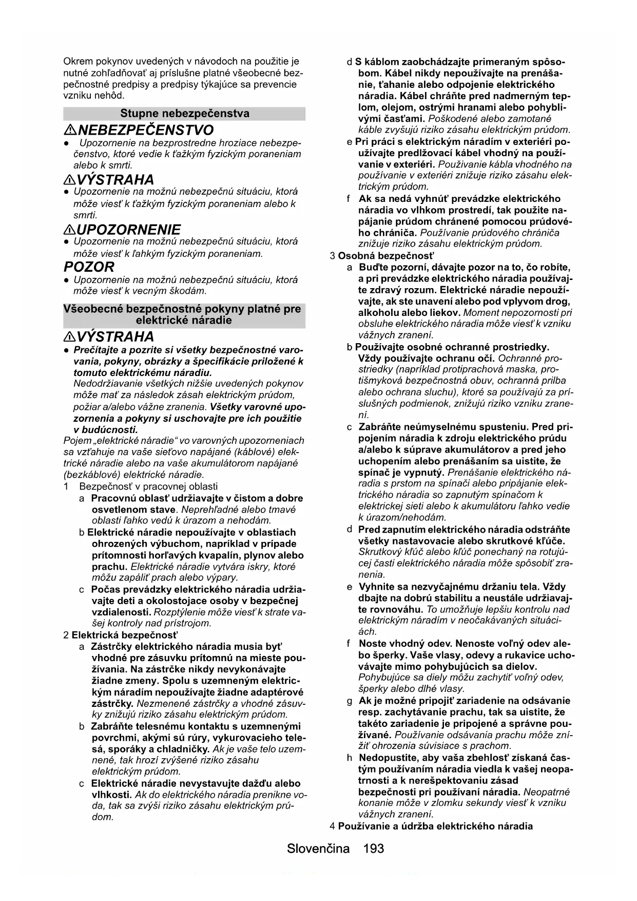 - EÚ vyhlásenie o zhode Slovenčina 193 Okrem pokynov uvedených v návodoch na použitie je nutné zohľadňovať aj príslušne platné všeobecné bez- pečnostné predpisy a predpisy týkajúce sa prevencie vzniku nehôd. Stupne nebezpečenstva NEBEZPEČENSTVO ● Upozornenie na bezprostredne hroziace nebezpe- čenstvo, ktoré vedie k ťažkým fyzickým poraneniam alebo k smrti. 몇 VÝSTRAHA ● Upozornenie na možnú nebezpečnú situáciu, ktorá môže viesť k ťažkým fyzickým poraneniam alebo k smrti. 몇 UPOZORNENIE ● Upozornenie na možnú nebezpečnú situáciu, ktorá môže viesť k ľahkým fyzickým poraneniam. POZOR ● Upozornenie na možnú nebezpečnú situáciu, ktorá môže viesť k vecným škodám. Všeobecné bezpečnostné pokyny platné pre elektrické náradie 몇 VÝSTRAHA ● Prečítajte a pozrite si všetky bezpečnostné varo- vania, pokyny, obrázky a špecifikácie priložené k tomuto elektrickému náradiu. Nedodržiavanie všetkých nižšie uvedených pokynov môže mať za následok zásah elektrickým prúdom, požiar a/alebo vážne zranenia. Všetky varovné upo- zornenia a pokyny si uschovajte pre ich použitie v budúcnosti. Pojem „elektrické náradie“ vo varovných upozorneniach sa vzťahuje na vaše sieťovo napájané (káblové) elek- trické náradie alebo na vaše akumulátorom napájané (bezkáblové) elektrické náradie. 1 Bezpečnosť v pracovnej oblasti a Pracovnú oblasť udržiavajte v čistom a dobre osvetlenom stave. Neprehľadné alebo tmavé oblasti ľahko vedú k úrazom a nehodám. b Elektrické náradie nepoužívajte v oblastiach ohrozených výbuchom, napríklad v prípade prítomnosti horľavých kvapalín, plynov alebo prachu. Elektrické náradie vytvára iskry, ktoré môžu zapáliť prach alebo výpary. c Počas prevádzky elektrického náradia udržia- vajte deti a okolostojace osoby v bezpečnej vzdialenosti. Rozptýlenie môže viesť k strate va- šej kontroly nad prístrojom. 2 Elektrická bezpečnosť a Zástrčky elektrického náradia musia byť vhodné pre zásuvku prítomnú na mieste pou- žívania. Na zástrčke nikdy nevykonávajte žiadne zmeny. Spolu s uzemneným elektric- kým náradím nepoužívajte žiadne adaptérové zástrčky. Nezmenené zástrčky a vhodné zásuv- ky znižujú riziko zásahu elektrickým prúdom. b Zabráňte telesnému kontaktu s uzemnenými povrchmi, akými sú rúry, vykurovacieho tele- sá, sporáky a chladničky. Ak je vaše telo uzem- nené, tak hrozí zvýšené riziko zásahu elektrickým prúdom. c Elektrické náradie nevystavujte dažďu alebo vlhkosti. Ak do elektrického náradia prenikne vo- da, tak sa zvýši riziko zásahu elektrickým prú- dom. d S káblom zaobchádzajte primeraným spôso- bom. Kábel nikdy nepoužívajte na prenáša- nie, ťahanie alebo odpojenie elektrického náradia. Kábel chráňte pred nadmerným tep- lom, olejom, ostrými hranami alebo pohybli- vými časťami. Poškodené alebo zamotané káble zvyšujú riziko zásahu elektrickým prúdom. e Pri práci s elektrickým náradím v exteriéri po- užívajte predlžovací kábel vhodný na použí- vanie v exteriéri. Použivanie kábla vhodného na používanie v exteriéri znižuje riziko zásahu elek- trickým prúdom. f Ak sa nedá vyhnúť prevádzke elektrického náradia vo vlhkom prostredí, tak použite na- pájanie prúdom chránené pomocou prúdové- ho chrániča. Používanie prúdového chrániča znižuje riziko zásahu elektrickým prúdom. 3 Osobná bezpečnosť a Buďte pozorní, dávajte pozor na to, čo robíte, a pri prevádzke elektrického náradia používaj- te zdravý rozum. Elektrické náradie nepouží- vajte, ak ste unavení alebo pod vplyvom drog, alkoholu alebo liekov. Moment nepozornosti pri obsluhe elektrického náradia môže viesť k vzniku vážnych zranení. b Používajte osobné ochranné prostriedky. Vždy používajte ochranu očí. Ochranné pro- striedky (napríklad protiprachová maska, pro- tišmyková bezpečnostná obuv, ochranná prilba alebo ochrana sluchu), ktoré sa používajú za prí- slušných podmienok, znižujú riziko vzniku zrane- ní. c Zabráňte neúmyselnému spusteniu. Pred pri- pojením náradia k zdroju elektrického prúdu a/alebo k súprave akumulátorov a pred jeho uchopením alebo prenášaním sa uistite, že spínač je vypnutý. Prenášanie elektrického ná- radia s prstom na spínači alebo pripájanie elek- trického náradia so zapnutým spínačom k elektrickej sieti alebo k akumulátoru ľahko vedie k úrazom/nehodám. p. 202