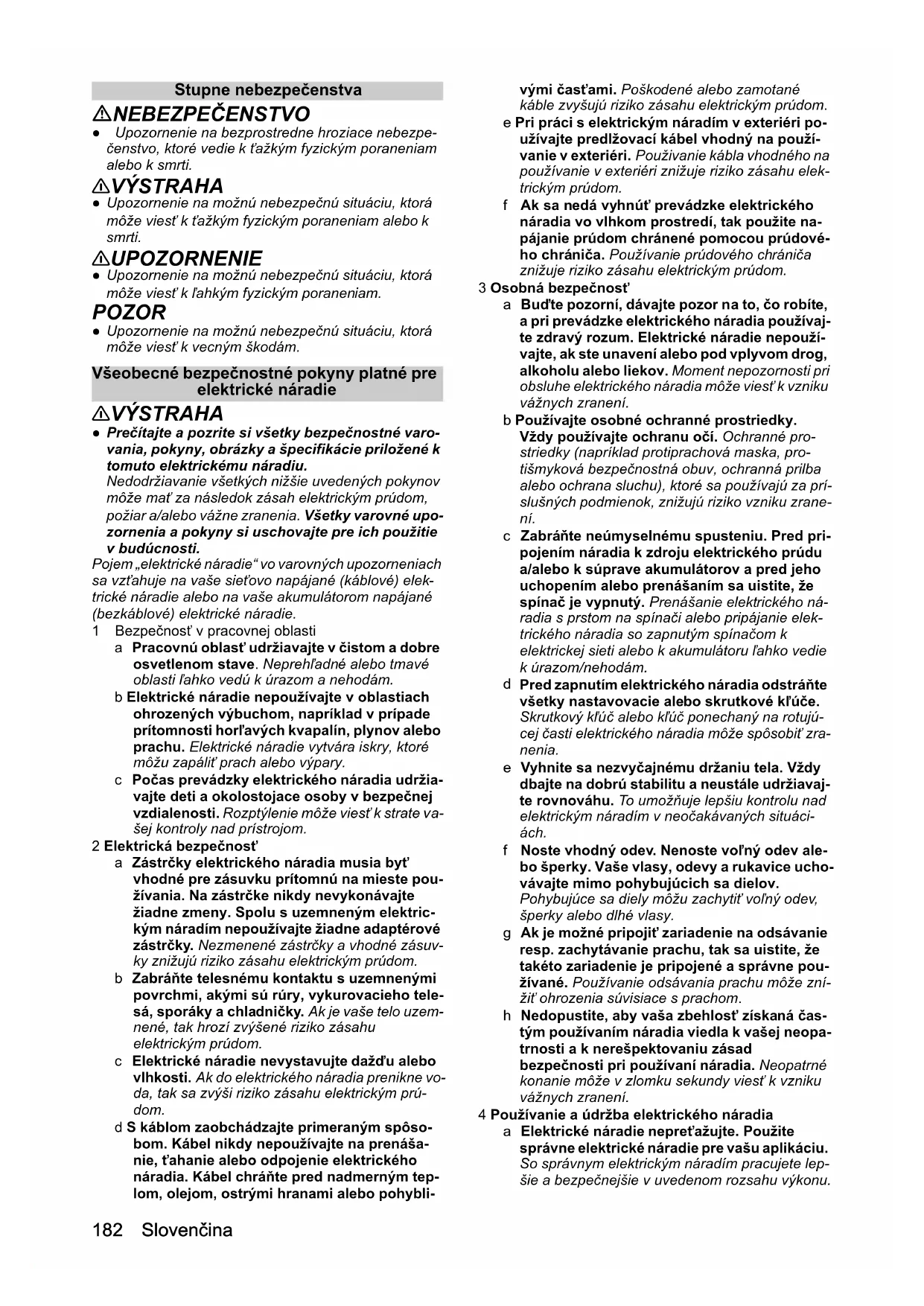 - EÚ vyhlásenie o zhode 82 Slovenčina Stupne nebezpečenstva NEBEZPEČENSTVO ● Upozornenie na bezprostredne hroziace nebezpe- čenstvo, ktoré vedie k ťažkým fyzickým poraneniam alebo k smrti. 몇 VÝSTRAHA ● Upozornenie na možnú nebezpečnú situáciu, ktorá môže viesť k ťažkým fyzickým poraneniam alebo k smrti. 몇 UPOZORNENIE ● Upozornenie na možnú nebezpečnú situáciu, ktorá môže viesť k ľahkým fyzickým poraneniam. POZOR ● Upozornenie na možnú nebezpečnú situáciu, ktorá môže viesť k vecným škodám. Všeobecné bezpečnostné pokyny platné pre elektrické náradie 몇 VÝSTRAHA ● Prečítajte a pozrite si všetky bezpečnostné varo- vania, pokyny, obrázky a špecifikácie priložené k tomuto elektrickému náradiu. Nedodržiavanie všetkých nižšie uvedených pokynov môže mať za následok zásah elektrickým prúdom, požiar a/alebo vážne zranenia. Všetky varovné upo- zornenia a pokyny si uschovajte pre ich použitie v budúcnosti. Pojem „elektrické náradie“ vo varovných upozorneniach sa vzťahuje na vaše sieťovo napájané (káblové) elek- trické náradie alebo na vaše akumulátorom napájané (bezkáblové) elektrické náradie. 1 Bezpečnosť v pracovnej oblasti a Pracovnú oblasť udržiavajte v čistom a dobre osvetlenom stave. Neprehľadné alebo tmavé oblasti ľahko vedú k úrazom a nehodám. b Elektrické náradie nepoužívajte v oblastiach ohrozených výbuchom, napríklad v prípade prítomnosti horľavých kvapalín, plynov alebo prachu. Elektrické náradie vytvára iskry, ktoré môžu zapáliť prach alebo výpary. c Počas prevádzky elektrického náradia udržia- vajte deti a okolostojace osoby v bezpečnej vzdialenosti. Rozptýlenie môže viesť k strate va- šej kontroly nad prístrojom. 2 Elektrická bezpečnosť a Zástrčky elektrického náradia musia byť vhodné pre zásuvku prítomnú na mieste pou- žívania. Na zástrčke nikdy nevykonávajte žiadne zmeny. Spolu s uzemneným elektric- kým náradím nepoužívajte žiadne adaptérové zástrčky. Nezmenené zástrčky a vhodné zásuv- ky znižujú riziko zásahu elektrickým prúdom. b Zabráňte telesnému kontaktu s uzemnenými povrchmi, akými sú rúry, vykurovacieho tele- sá, sporáky a chladničky. Ak je vaše telo uzem- nené, tak hrozí zvýšené riziko zásahu elektrickým prúdom. c Elektrické náradie nevystavujte dažďu alebo vlhkosti. Ak do elektrického náradia prenikne vo- da, tak sa zvýši riziko zásahu elektrickým prú- dom. d S káblom zaobchádzajte primeraným spôso- bom. Kábel nikdy nepoužívajte na prenáša- nie, ťahanie alebo odpojenie elektrického náradia. Kábel chráňte pred nadmerným tep- lom, olejom, ostrými hranami alebo pohybli- vými časťami. Poškodené alebo zamotané káble zvyšujú riziko zásahu elektrickým prúdom. e Pri práci s elektrickým náradím v exteriéri po- užívajte predlžovací kábel vhodný na použí- vanie v exteriéri. Použivanie kábla vhodného na používanie v exteriéri znižuje riziko zásahu elek- trickým prúdom. f Ak sa nedá vyhnúť prevádzke elektrického náradia vo vlhkom prostredí, tak použite na- pájanie prúdom chránené pomocou prúdové- ho chrániča. Používanie prúdového chrániča znižuje riziko zásahu elektrickým prúdom. 3 Osobná bezpečnosť a Buďte pozorní, dávajte pozor na to, čo robíte, a pri prevádzke elektrického náradia používaj- te zdravý rozum. Elektrické náradie nepouží- vajte, ak ste unavení alebo pod vplyvom drog, alkoholu alebo liekov. Moment nepozornosti pri obsluhe elektrického náradia môže viesť k vzniku vážnych zranení. b Používajte osobné ochranné prostriedky. Vždy používajte ochranu očí. Ochranné pro- striedky (napríklad protiprachová maska, pro- tišmyková bezpečnostná obuv, ochranná prilba alebo ochrana sluchu), ktoré sa používajú za prí- slušných podmienok, znižujú riziko vzniku zrane- ní. c Zabráňte neúmyselnému spusteniu. Pred pri- pojením náradia k zdroju elektrického prúdu a/alebo k súprave akumulátorov a pred jeho uchopením alebo prenášaním sa uistite, že spínač je vypnutý. Prenášanie elektrického ná- radia s prstom na spínači alebo pripájanie elek- trického náradia so zapnutým spínačom k elektrickej sieti alebo k akumulátoru ľahko vedie k úrazom/nehodám. p. 1901