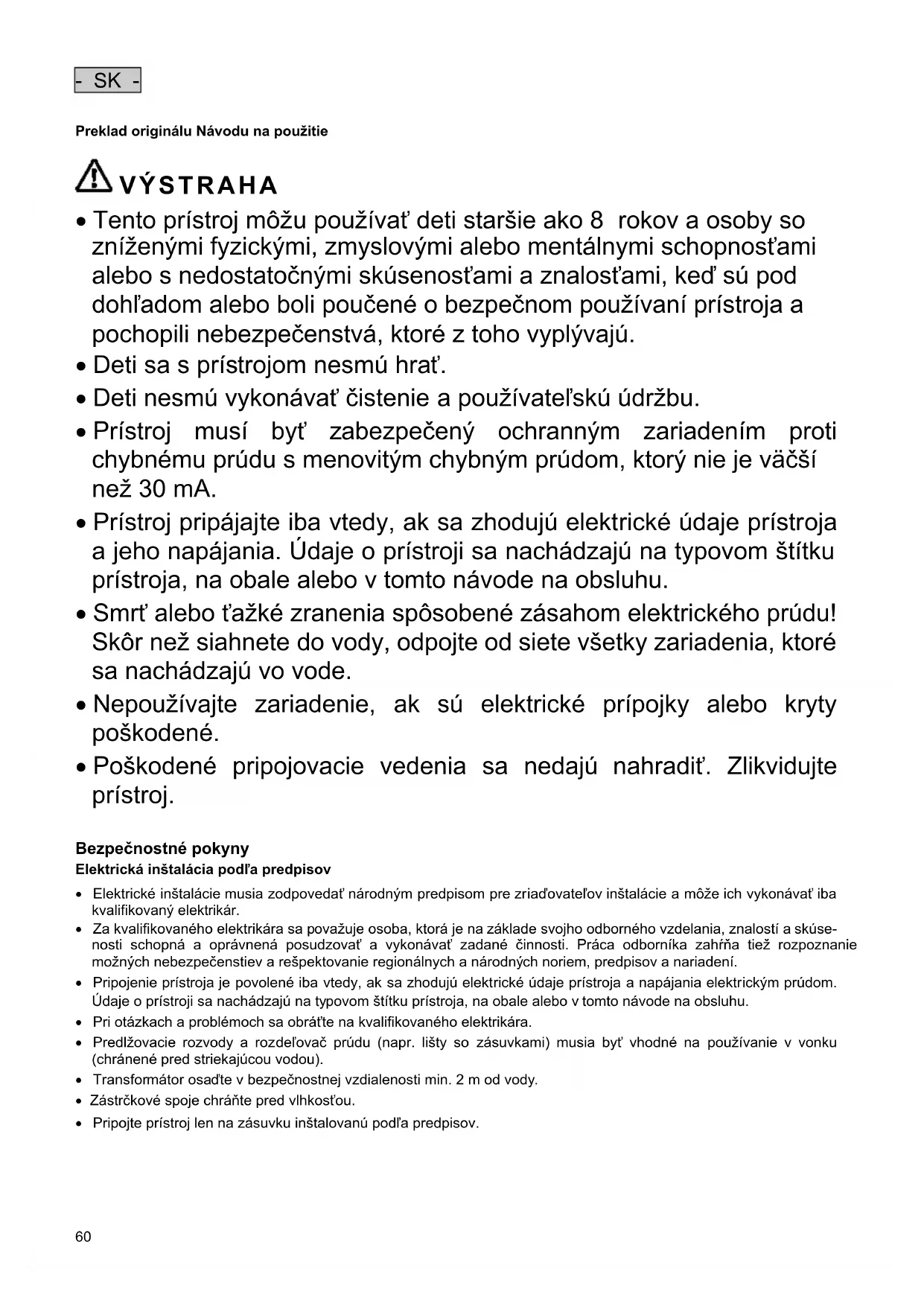 - Prístroj musí byť zabezpečený ochranným zariadením proti chybnému prúdu s menovitým chybným prúdom, ktorý nie je väčší než 30 mA.