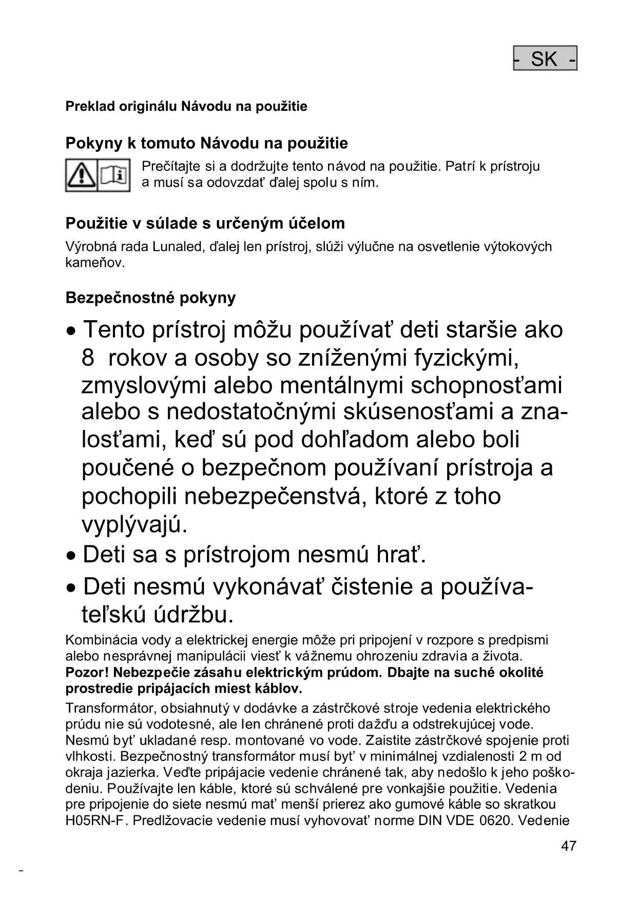 používajte v rozvinutom stave. Elektrické inštalácie na záhradných rybníčkoch a plaveckých bazénoch musia zodpovedat’ národným a medzinárodným ustanove- niam pre zriadzovateľov. Porovnajte elektrické údaje napájacej siete s typovým štítkom. V prípade poškodenia kábla alebo krytu sa nesmie prístroj prevádzkovať! Vytia- hnite vidlicu zo zástrčky! Nenoste resp. neťhajte prístroj na prívodnom vedení. Prevádzkujte prístroj výhradne s príslušným bezpečnostným transformátorom, ktorý je súčast’ou dodávky. Neotvárajte nikdy kryt zariadenia alebo častí jeho prís- lušenstva, pokiaľ to nie je vyslovene uvedené v pokynoch Návodu na použitie. Než začnete vykonávat’ prácu na prístroji, vytiahnite vždy vidlicu zo zástrčky u všetkých zariadení vo vode a u tohoto prístroja! Pri otázkach a problémoch sa pre Vašu vlastnú bezpečnosť obráťte na odborníka v obore elektrotechniky!