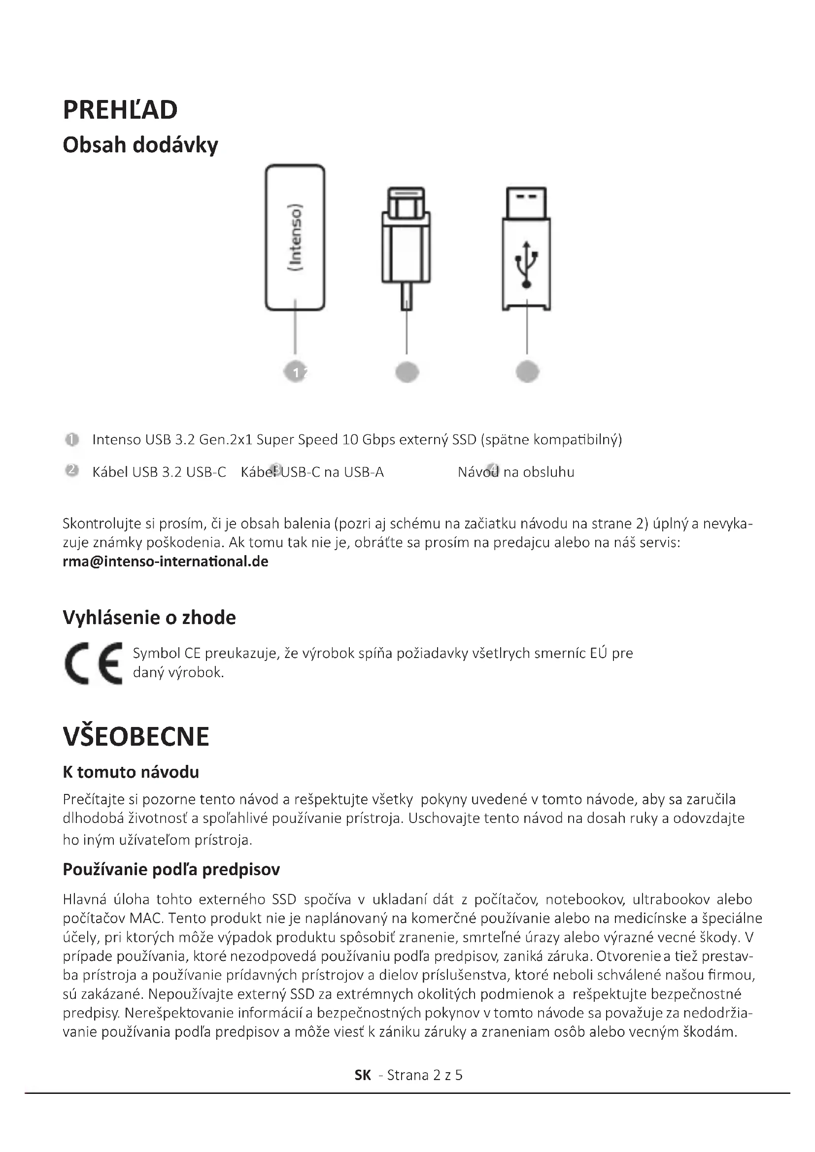 - Vylúčenie záruky SK - Strana 1 z 5PREHĽAD Obsah dodávky Skontrolujte si prosím, či je obsah balenia (pozri aj schému na začiatku návodu na strane 2) úplný a nevyka- zuje známky poškodenia. Ak tomu tak nie je, obráťte sa prosím na predajcu alebo na náš servis: rma@intenso-internaonal.de Vyhlásenie o zhode Symbol CE preukazuje, že výrobok spíňa požiadavky všetlrych smerníc EÚ pre daný výrobok. VŠEOBECNE K tomuto návodu Prečítajte si pozorne tento návod a rešpektujte všetky pokyny uvedené v tomto návode, aby sa zaručila dlhodobá životnosť a spoľahlivé používanie prístroja. Uschovajte tento návod na dosah ruky a odovzdajte ho iným užívateľom prístroja. Používanie podľa predpisov Hlavná úloha tohto externého SSD spočíva v ukladaní dát z počítačov, notebookov, ultrabookov alebo počítačov MAC. Tento produkt nie je naplánovaný na komerčné používanie alebo na medicínske a špeciálne účely, pri ktorých môže výpadok produktu spôsobiť zranenie, smrteľné úrazy alebo výrazné vecné škody. V prípade používania, ktoré nezodpovedá používaniu podľa predpisov, zaniká záruka. Otvorenie a ež prestav- ba prístroja a používanie prídavných prístrojov a dielov príslušenstva, ktoré neboli schválené našou rmou, sú zakázané. Nepoužívajte externý SSD za extrémnych okolitých podmienok a rešpektujte bezpečnostné predpisy. Nerešpektovanie informácií a bezpečnostných pokynov v tomto návode sa považuje za nedodržia- vanie používania podľa predpisov a môže viesť k zániku záruky a zraneniam osôb alebo vecným škodám. SK - Strana 2 z 5 Intenso USB 3.2 Gen.2x1 Super Speed 10 Gbps externý SSD (spätne kompabilný) Kábel USB 3.2 USB-C Kábel USB-C na USB-A Návod na obsluhu p. 5
