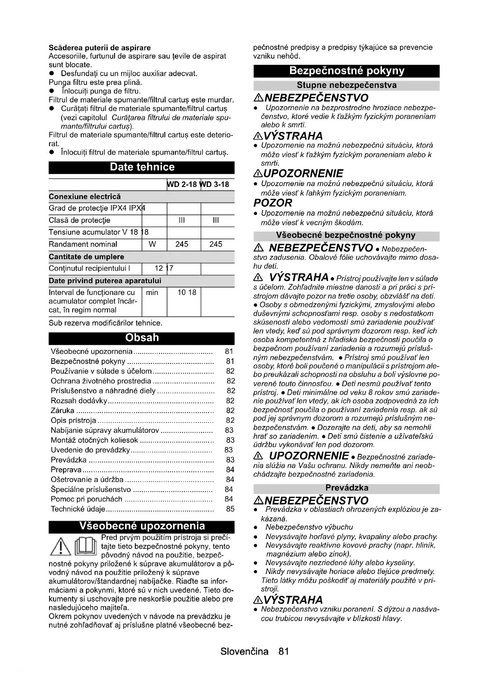 - Aparatul se oprește automat Aparatul/acumulatorul se supraîncălzește. Așteptați răcirea aparatului/acumulatorului.Slovenčina 81 Scăderea puterii de aspirare Accesoriile, furtunul de aspirare sau țevile de aspirat sunt blocate. Desfundați cu un mijloc auxiliar adecvat. Punga filtru este prea plină. Înlocuiți punga de filtru. Filtrul de materiale spumante/filtrul cartuș este murdar. Curățați filtrul de materiale spumante/filtrul cartuș (vezi capitolul Curăţarea filtrului de materiale spu- mante/filtrului cartuș). Filtrul de materiale spumante/filtrul cartuș este deterio- rat. Înlocuiți filtrul de materiale spumante/filtrul cartuș. Date tehnice Sub rezerva modificărilor tehnice. Obsah Všeobecné upozornenia Pred prvým použitím prístroja si prečí- tajte tieto bezpečnostné pokyny, tento pôvodný návod na použitie, bezpeč- nostné pokyny priložené k súprave akumulátorov a pô- vodný návod na použitie priložený k súprave akumulátorov/štandardnej nabíjačke. Riaďte sa infor- máciami a pokynmi, ktoré sú v nich uvedené. Tieto do- kumenty si uschovajte pre neskoršie použitie alebo pre nasledujúceho majiteľa. Okrem pokynov uvedených v návode na prevádzku je nutné zohľadňovať aj príslušne platné všeobecné bez- pečnostné predpisy a predpisy týkajúce sa prevencie vzniku nehôd. Bezpečnostné pokyny Stupne nebezpečenstva NEBEZPEČENSTVO ● Upozornenie na bezprostredne hroziace nebezpe- čenstvo, ktoré vedie k ťažkým fyzickým poraneniam alebo k smrti. 몇 VÝSTRAHA ● Upozornenie na možnú nebezpečnú situáciu, ktorá môže viesť k ťažkým fyzickým poraneniam alebo k smrti. 몇 UPOZORNENIE ● Upozornenie na možnú nebezpečnú situáciu, ktorá môže viesť k ľahkým fyzickým poraneniam. POZOR ● Upozornenie na možnú nebezpečnú situáciu, ktorá môže viesť k vecným škodám. Všeobecné bezpečnostné pokyny NEBEZPEČENSTVO ● Nebezpečen- stvo zadusenia. Obalové fólie uchovávajte mimo dosa- hu detí. 몇 VÝSTRAHA ● Prístroj používajte len v súlade s účelom. Zohľadnite miestne danosti a pri práci s prí- strojom dávajte pozor na tretie osoby, obzvlášť na deti. ● Osoby s obmedzenými fyzickými, zmyslovými alebo duševnými schopnosťami resp. osoby s nedostatkom skúseností alebo vedomostí smú zariadenie používať len vtedy, keď sú pod správnym dozorom resp. keď ich osoba kompetentná z hľadiska bezpečnosti poučila o bezpečnom používaní zariadenia a rozumejú prísluš- ným nebezpečenstvám. ● Prístroj smú používať len osoby, ktoré boli poučené o manipulácii s prístrojom ale- bo preukázali schopnosti na obsluhu a boli výslovne po- verené touto činnosťou. ● Deti nesmú používať tento prístroj. ● Deti minimálne od veku 8 rokov smú zariade- nie používať len vtedy, ak ich osoba zodpovedná za ich bezpečnosť poučila o používaní zariadenia resp. ak sú pod jej správnym dozorom a rozumejú príslušným ne- bezpečenstvám. ● Dozerajte na deti, aby sa nemohli hrať so zariadením. ● Deti smú čistenie a užívateľskú údržbu vykonávať len pod dozorom. 몇 UPOZORNENIE ● Bezpečnostné zariade- nia slúžia na Vašu ochranu. Nikdy nemeňte ani neob- chádzajte bezpečnostné zariadenia. Prevádzka NEBEZPEČENSTVO ● Prevádzka v oblastiach ohrozených explóziou je za- kázaná. ● Nebezpečenstvo výbuchu ● Nevysávajte horľavé plyny, kvapaliny alebo prachy. ● Nevysávajte reaktívne kovové prachy (napr. hliník, magnézium alebo zinok). ● Nevysávajte nezriedené lúhy alebo kyseliny. ● Nikdy nevysávajte horiace alebo tlejúce predmety. Tieto látky môžu poškodiť aj materiály použité v prí- stroji. 몇 VÝSTRAHA ● Nebezpečenstvo vzniku poranení. S dýzou a nasáva- cou trubicou nevysávajte v blízkosti hlavy. WD 2-18 WD 3-18 Conexiune electrică Grad de protecţie IPX4 IPX4 Clasă de protecţie III III Tensiune acumulator V 18 18 Randament nominal W 245 245 Cantitate de umplere Conţinutul recipientului l 12 17 Date privind puterea aparatului Interval de funcționare cu acumulator complet încăr- cat, în regim normal min 10 18 Všeobecné upozornenia p. 81