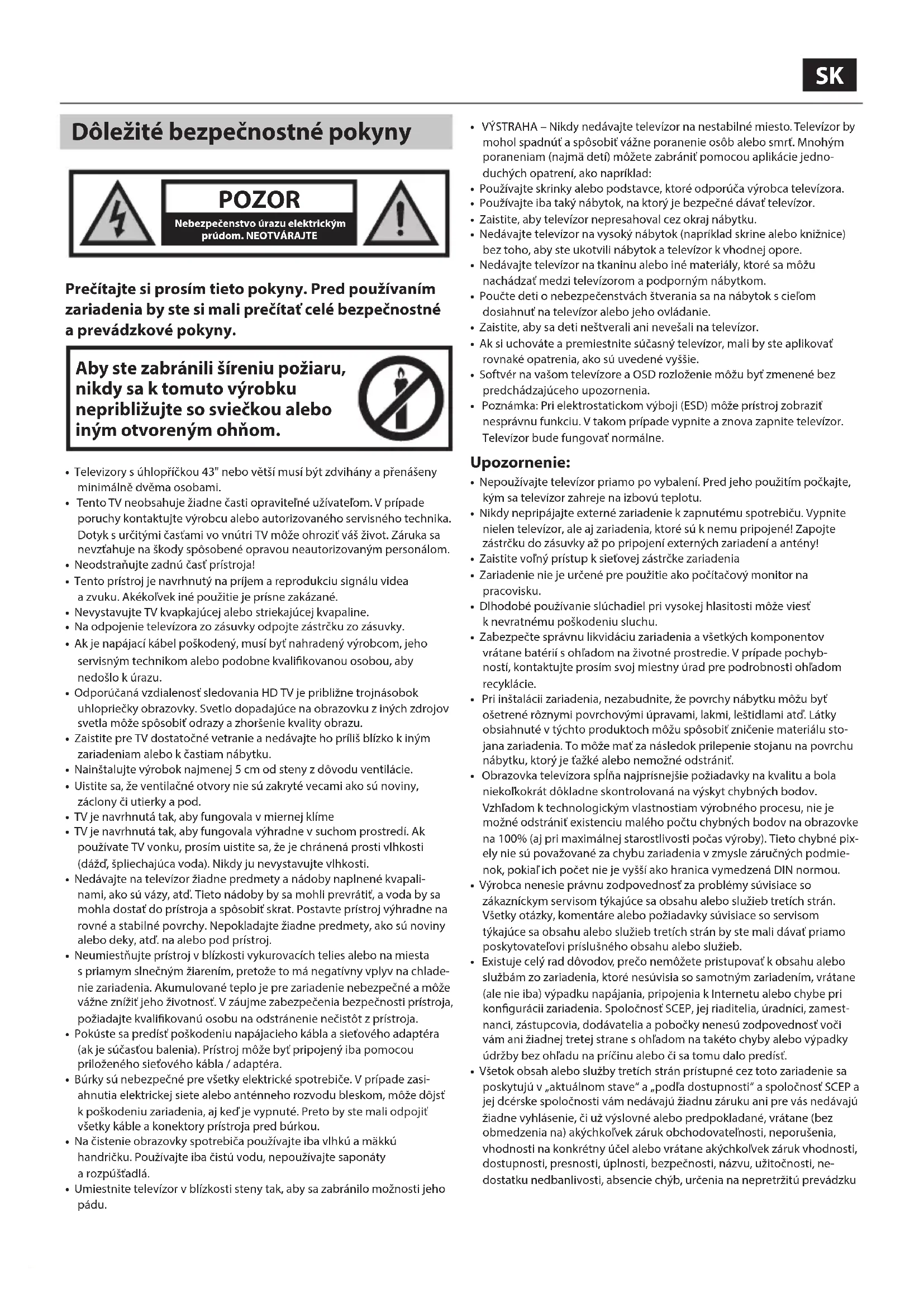 - Tento TV neobsahuje žiadne časti opraviteľné užívateľom. Vprípade poruchy kontaktujte výrobcu alebo autorizovaného servisného technika. Dotyk surčitými časťami vo vnútri TV môže ohroziť váš život. Záruka sa nevzťahuje na škody spôsobené opravou neautorizovaným personálom.