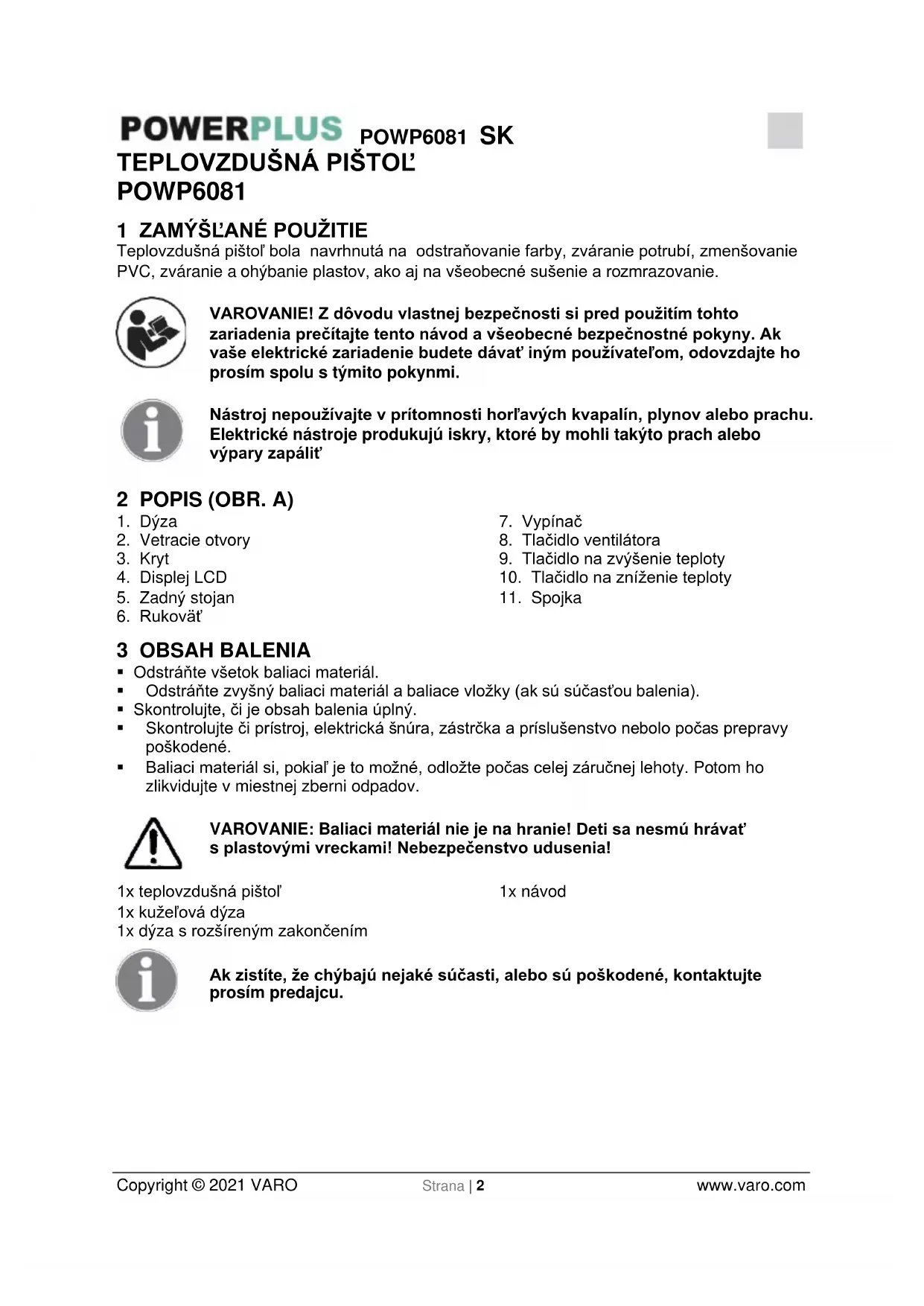 - Servis elektrického náradia zverte kvalifikovanému opravárovi. Môžu sa používať iba rovnaké náhradné diely. Zaručíte tak, že bude zachovaná bezpečnosť elektrického náradia.POWP6081 SK Copyright © 2021 VARO Strana | 5 www.varo.com 6 DOPLNKOVÉ BEZPEČNOSTNÉ POKYNY PRE TEPLOVZDUŠNÉ PIŠTOLE