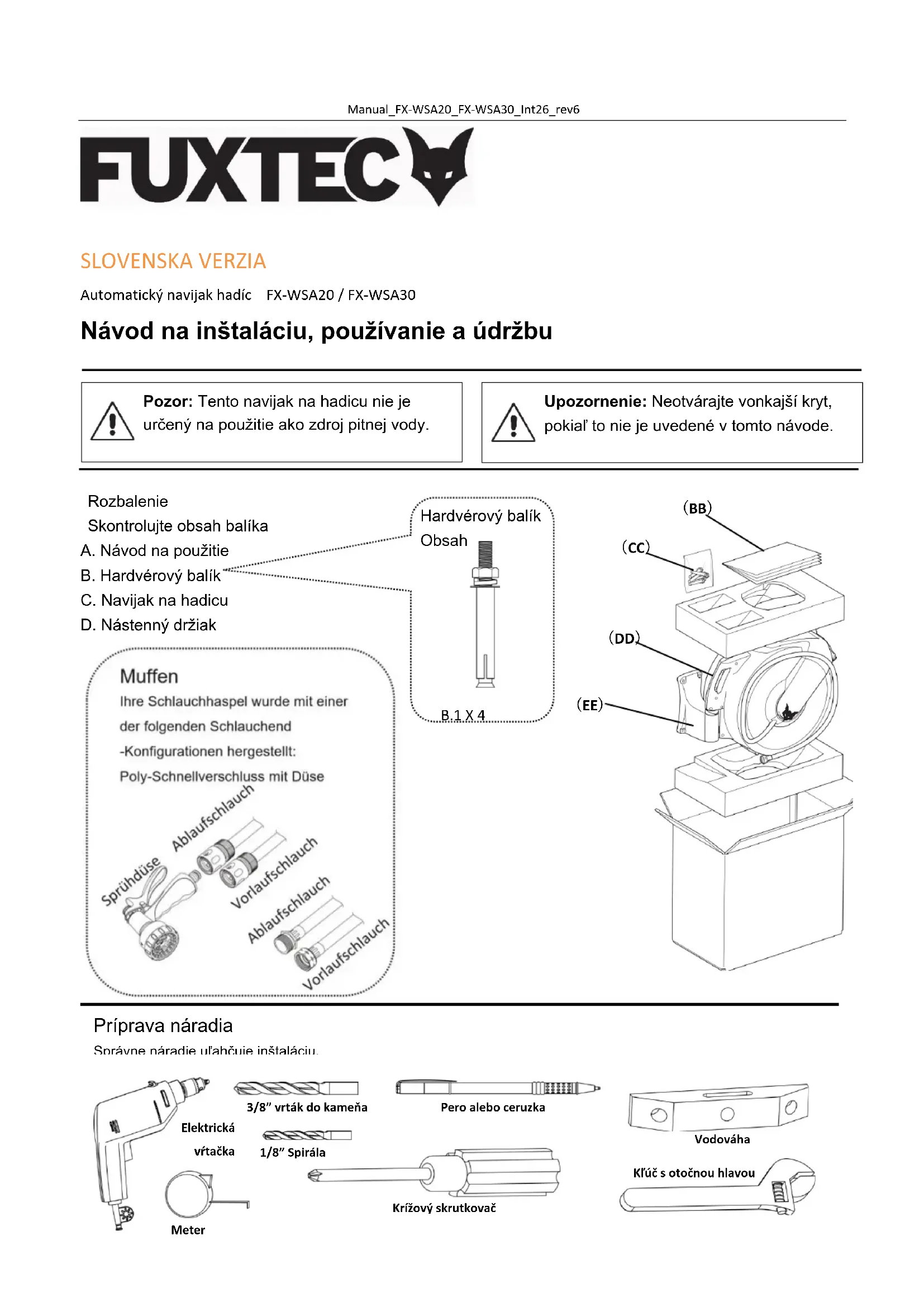 Tipy na údržbu a starostlivosť - Ak hadicu nepoužívate, uzavrite prívod vody a uvoľnite tlak z hadice. - Aby ste zabránili zamrznutiu a možnému poškodeniu navijaka hadice, počas zimných mesiacov ho skladujte v uzavretých priestoroch. - Puzdro a hadicu čistite iba jemným mydlom a vodou. Ak máte problémy s používaním alebo montážou tohto produktu, obráťte sa na zákaznícky servis. Môžete nás kontaktovať telefonicky na čísle +49 (0)07032/9560888 alebo e-mailom na adrese info@fuxtec.deManual_FX-WSA20_FX-WSA30_Int26_rev6