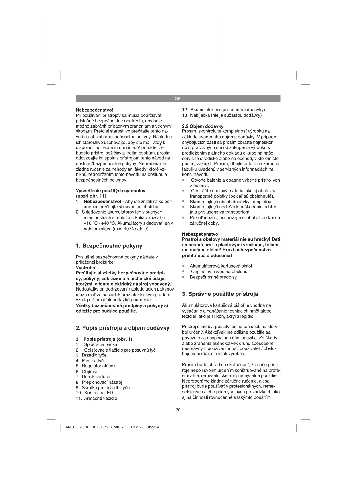 Akumulátorová kartušová pištoľ je vhodná na vytláčanie a nanášanie tesniacich hmôt alebo lepidiel, ako je silikón, akryl a lepidlo. Prístroj smie byť použitý len na ten účel, na ktorý bol určený. Akékoľvek iné odlišné použitie sa považuje za nespĺňajúce účel použitia. Za škody alebo zranenia akéhokoľvek druhu spôsobené nesprávnym používaním ručí používateľ / obslu- hujúca osoba, nie však výrobca. Prosím berte ohľad na skutočnosť, že naše príst- roje neboli svojim určením konštruované na profe- sionálne, remeselnícke ani priemyselné použitie. Nepreberáme žiadne záručné ručenie, ak sa prístroj bude používať v profesionálnych, reme- selníckych alebo priemyselných prevádzkach ako aj na činnosti rovnocenné s takýmto použitím. Anl_TE_SG_18_10_Li_SPK13.indb 70 09.03.2022 10:22:24SK