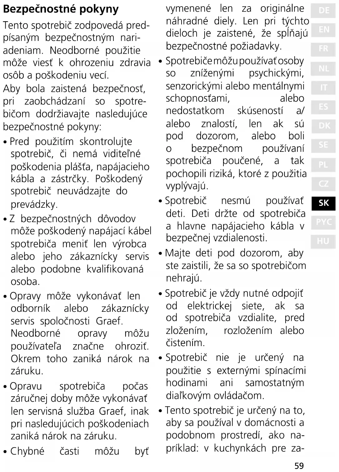 - Opravu spotrebiča počas záručnej doby môže vykonávať len servisná služba Graef, inak pri nasledujúcich poškodeniach zaniká nárok na záruku.