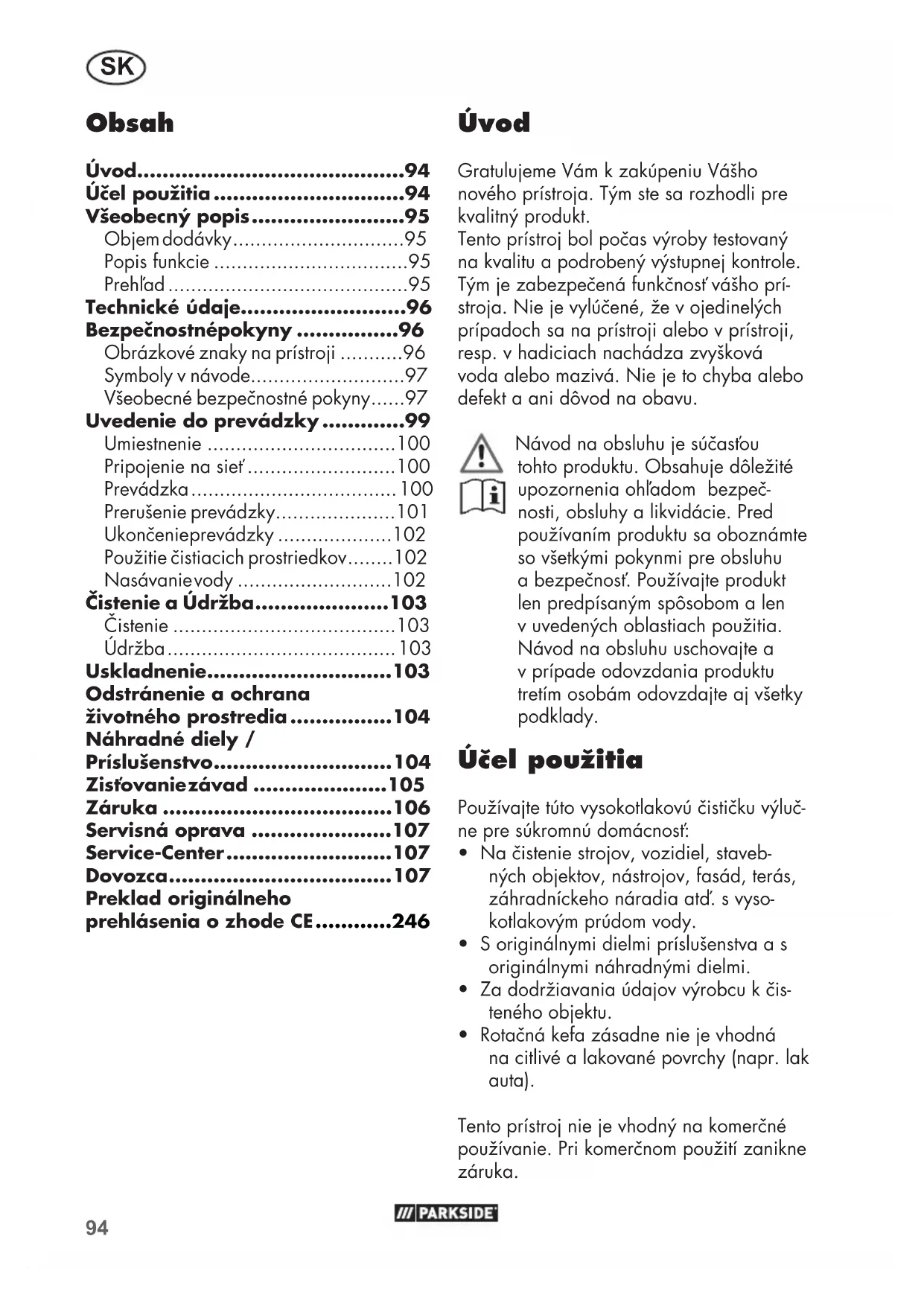 Úvod Gratulujeme Vám k zakúpeniu Vášho nového prístroja. Tým ste sa rozhodli pre kvalitný produkt. Tento prístroj bol počas výroby testovaný na kvalitu a podrobený výstupnej kontrole. Tým je zabezpečená funkčnosť vášho prí- stroja. Nie je vylúčené, že v ojedinelých prípadoch sa na prístroji alebo v prístroji, resp. v hadiciach nachádza zvyšková voda alebo mazivá. Nie je to chyba alebo defekt a ani dôvod na obavu. Návod na obsluhu je súčasťou tohto produktu. Obsahuje dôležité upozornenia ohľadom bezpeč- nosti, obsluhy a likvidácie. Pred používaním produktu sa oboznámte so všetkými pokynmi pre obsluhu a bezpečnosť. Používajte produkt len predpísaným spôsobom a len v uvedených oblastiach použitia. Návod na obsluhu uschovajte a v prípade odovzdania produktu tretím osobám odovzdajte aj všetky podklady. Účel použitia Používajte túto vysokotlakovú čističku výluč- ne pre súkromnú domácnosť:
