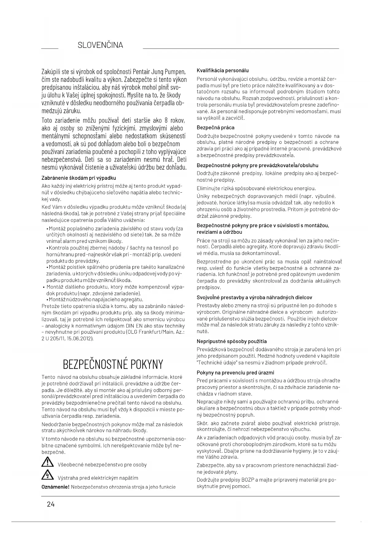 - Oběžné kolo opotřebeno = opravu smí provést výrobce 0197JUNG PUMPEN GmbH - Industriestr. 4-6 33803 Steinhagen, Germany 401.17-22.02EN 12050-2:2001; 2015Čerpací stanice odpadních vod bez fekálií DN 32 UV3 (JP50248)UV3 S (JP50249)UV3 S (JP50312)UV3 SF (JP50313)Sběr a automatické čerpání odpadních vod s fekálie-mi uvnitř a mimo budov nad úroveň zpětného vzdutíCHOVÁNÍ PŘI POŽÁRU NPDVODOTĚSNOST vyhovujeÚČINNOST (ZDVIH)- Doprava pevných látek vyhovuje- Potrubní přípojky vyhovuje- Větrání NPD- Minimální průtoková rychlost vyhovuje- Volný minimální prostup zařízení vyhovuje- Minimální užitný objem NPDMECHANICKÁ PEVNOST Nosnost a strukturální stabilita sběrné nádrže pro použití mimo budovy NPD - Strukturální stabilita sběrné nádrže pro použití uvnitř budov NPD HLUČNOST 70 dB(A)STÁLOST- Strukturální stability NPD- Zdvihu vyhovuje- Mechanické pevnosti NPDNEBEZPEČNÉ SUBSTANCE NPD24 SLOVENČINA Zakúpili ste si výrobok od spoločnosti Pentair Jung Pumpen, čím ste nadobudli kvalitu a výkon. Zabezpečte si tento výkon predpísanou inštaláciou, aby náš výrobok mohol plniť svo- ju úlohu k Vašej úplnej spokojnosti. Myslite na to, že škody vzniknuté v dôsledku neodborného používania čerpadla ob- medzujú záruku. Toto zariadenie môžu používať deti staršie ako 8 rokov, ako aj osoby so zníženými fyzickými, zmyslovými alebo mentálnymi schopnosťami alebo nedostatkom skúseností a vedomostí, ak sú pod dohľadom alebo boli o bezpečnom používaní zariadenia poučené a pochopili z toho vyplývajúce nebezpečenstvá. Deti sa so zariadením nesmú hrať. Deti nesmú vykonávať čistenie a užívateľskú údržbu bez dohľadu. Zabránenie škodám pri výpadku Ako každý iný elektrický prístroj môže aj tento produkt vypad- núť v dôsledku chýbajúceho sieťového napätia alebo technic- kej vady. Keď Vám v dôsledku výpadku produktu môže vzniknúť škoda (aj následná škoda), tak je potrebné z Vašej strany prať špeciálne nasledujúce opatrenia podľa Vášho uváženia:
