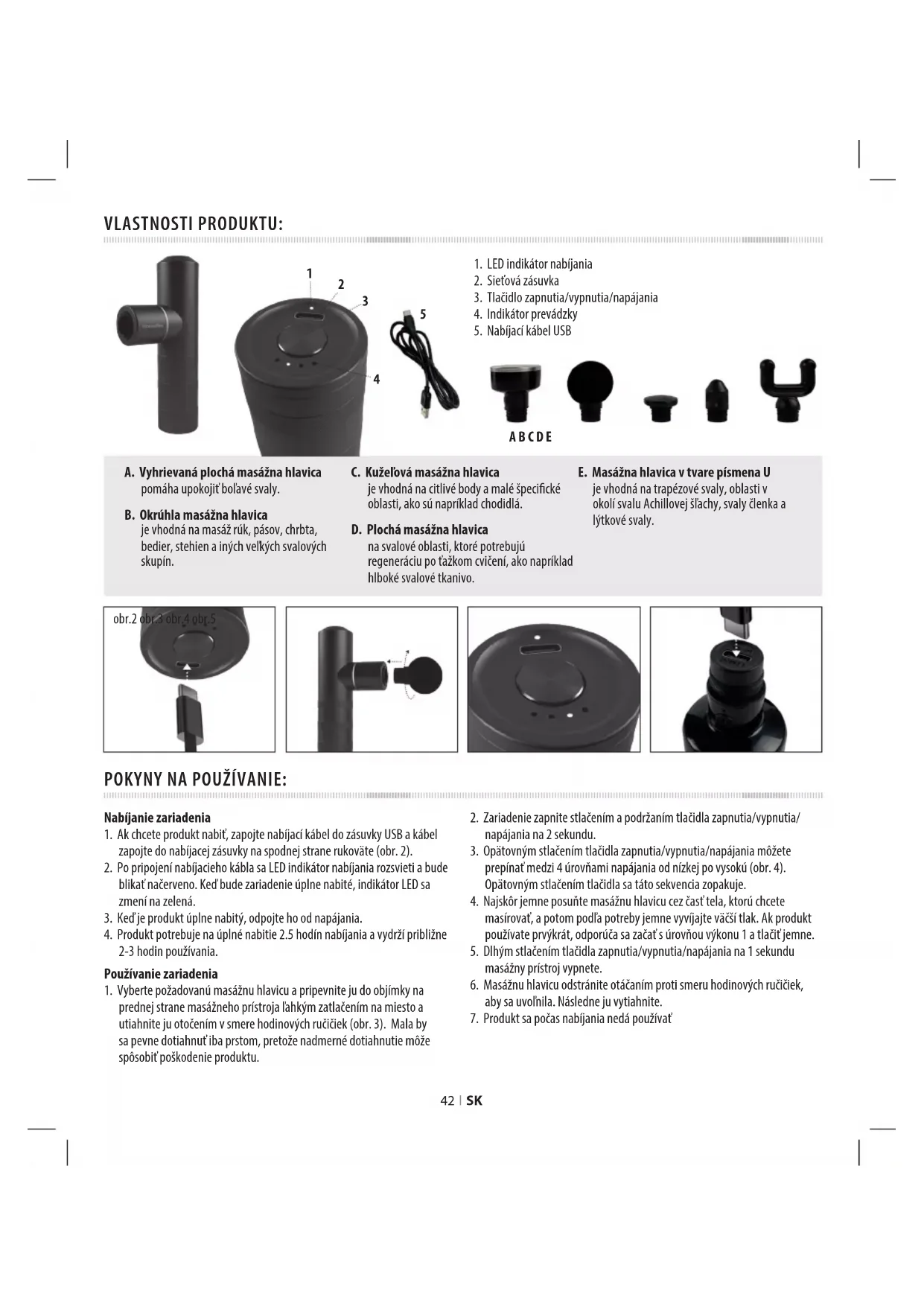 A B C D E42 I SK Používanie vyhrievanej plochej masážnej hlavice Vyhrievaná plochá masážna hlavica sa zahreje len za 15 sekúnd, čo je ideálne na upokojenie boľavých svalov.