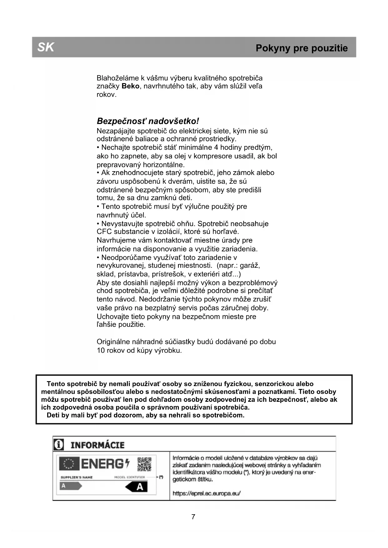Tento spotrebič by nemali používať osoby so zníženou fyzickou, senzorickou alebo mentálnou spôsobilosťou alebo s nedostatočnými skúsenosťami a poznatkami. Tieto osoby môžu spotrebič používať len pod dohľadom osoby zodpovednej za ich bezpečnosť, alebo ak ich zodpovedná osoba poučila o správnom používaní spotrebiča. Deti by mali byť pod dozorom, aby sa nehrali so spotrebičom.SK Pokyny pre pouzitie Elektrické požiadavky Pred zasunutím zástrčky do zásuvky v stene sa uistite, že napätie a frekvencia uvedené na výkonovom štítku zodpovedajú zásobovaniu elektrickou energiou. Zástrčka musí byť po inštalácii prístupná, aby sa umožnilo odpojenie zariadenia od sieťového napájania po inštalácii. Varovanie! Tento spotrebič musí byť uzemnený. Opravy elektrických prístrojov môžu vykonávať len kvalifikovaní experti. Ak je sieťový kábel poškodený, tak ho musí vymeniť výrobca alebo zákaznícky servis, aby sa predišlo nebezpečenstvu. POZOR! Tento spotrebič pracuje s plynom R600a, ktorý je ekologicky nezávadný, ale horľavý. Počas prepravy a zostavovania produktu dbajte na to, aby ste nepoškodili chladiaci systém. Ak je poškodený chladiaci systém a unikol zo systému plyn, držte zariadenie mimo otvoreného ohňa a na chvíľu vyvetrajte miestnosť. VAROVANIE – Nepoužívajte mechanické prístroje alebo iné prostriedky na urýchľovanie rozmrazovacieho procesu, inak ako odporúča výrobca. VAROVANIE – Nepoškoďte chladiaci okruh. VAROVANIE – Nepoužívajte elektrické zariadenia vo vnútri priestoru na potraviny, iba ak ide o typy odporúčané výrobcom. VAROVANIE – Ak je sieťový kábel poškodený, je potrebné, aby ho vymenil výrobca, servisný agent alebo podobne kvalifikovaná osoba, vyhnete sa tak možnému nebezpečenstvu. Prepravné pokyny