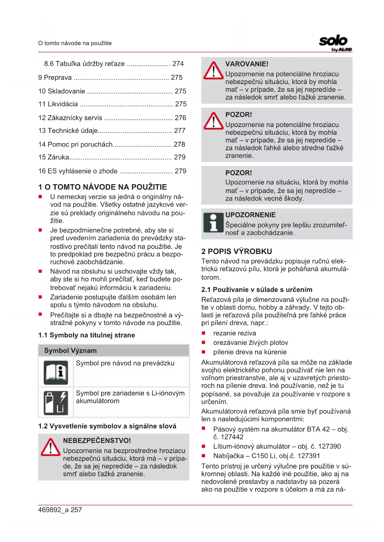 vá .......................................................257 2 Popis výrobku .......................................... 257