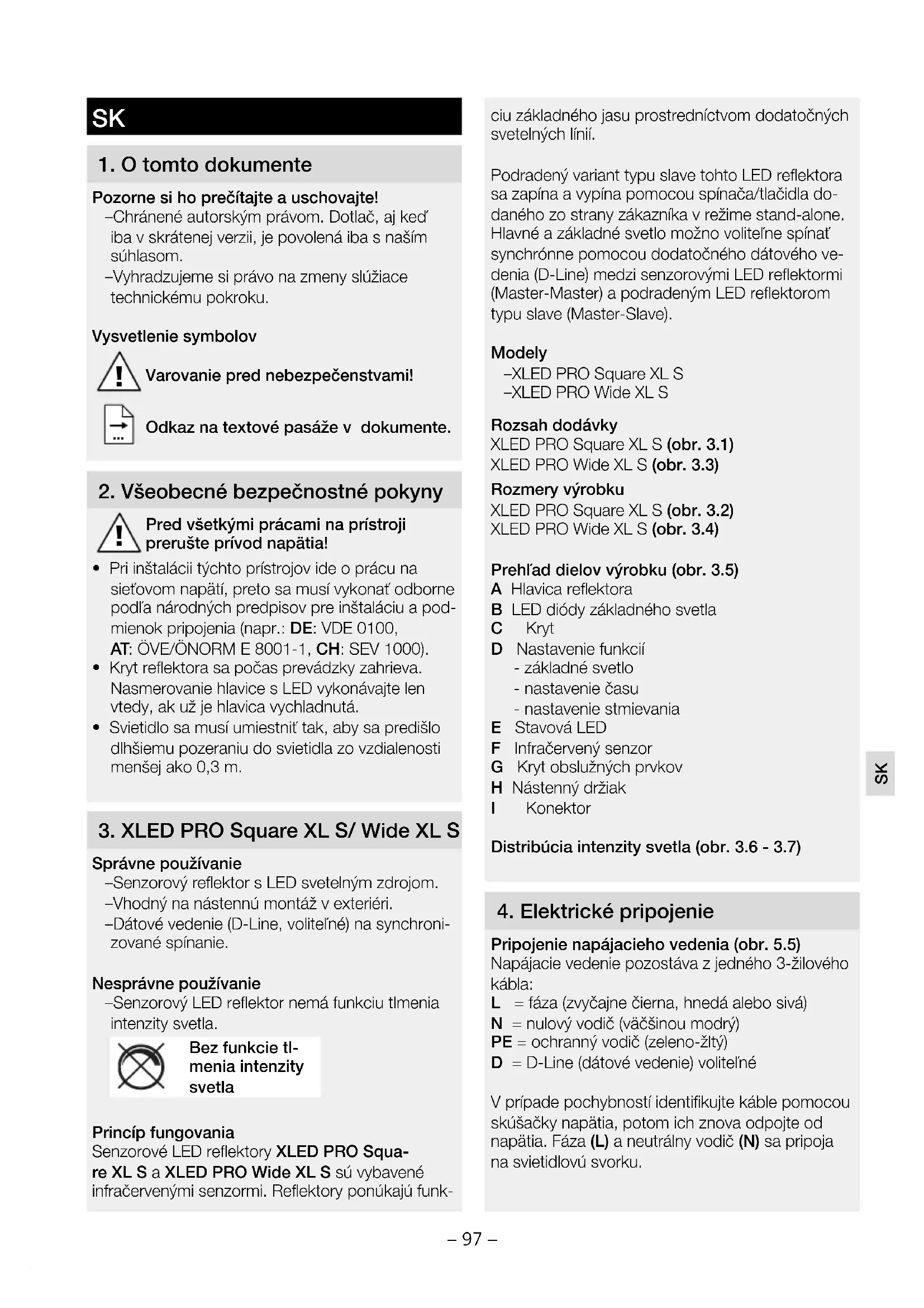 Správne používanie – Senzorový reflektor s LED svetelným zdrojom. – Vhodný na nástennú montáž v exteriéri. – Dátové vedenie (D-Line, voliteľné) na synchroni- zované spínanie. Nesprávne používanie – Senzorový LED reflektor nemá funkciu tlmenia intenzity svetla. Bez funkcie tl- menia intenzity svetla Princíp fungovania Senzorové LED reflektory XLEDPROSqua- reXLS aXLEDPROWideXLS sú vybavené infračervenými senzormi. Reflektory ponúkajú funk- ciu základného jasu prostredníctvom dodatočných svetelných línií. Podradený variant typu slave tohto LED reflektora sa zapína a vypína pomocou spínača/tlačidla do- daného zo strany zákazníka v režime stand-alone. Hlavné a základné svetlo možno voliteľne spínať synchrónne pomocou dodatočného dátového ve- denia (D-Line) medzi senzorovými LED reflektormi (Master-Master) a podradeným LED reflektorom typu slave (Master-Slave). Modely – XLEDPROSquareXLS – XLEDPROWideXLS Rozsah dodávky XLEDPROSquareXLS (obr. 3.1) XLEDPROWideXLS (obr. 3.3) Rozmery výrobku XLEDPROSquareXLS (obr. 3.2) XLEDPROWideXLS (obr. 3.4) Prehľad dielov výrobku (obr. 3.5) A Hlavica reflektora B LED diódy základného svetla C Kryt D Nastavenie funkcií - základné svetlo - nastavenie času - nastavenie stmievania E Stavová LED F Infračervený senzor G Kryt obslužných prvkov H Nástenný držiak I Konektor Distribúcia intenzity svetla (obr. 3.6 - 3.7)