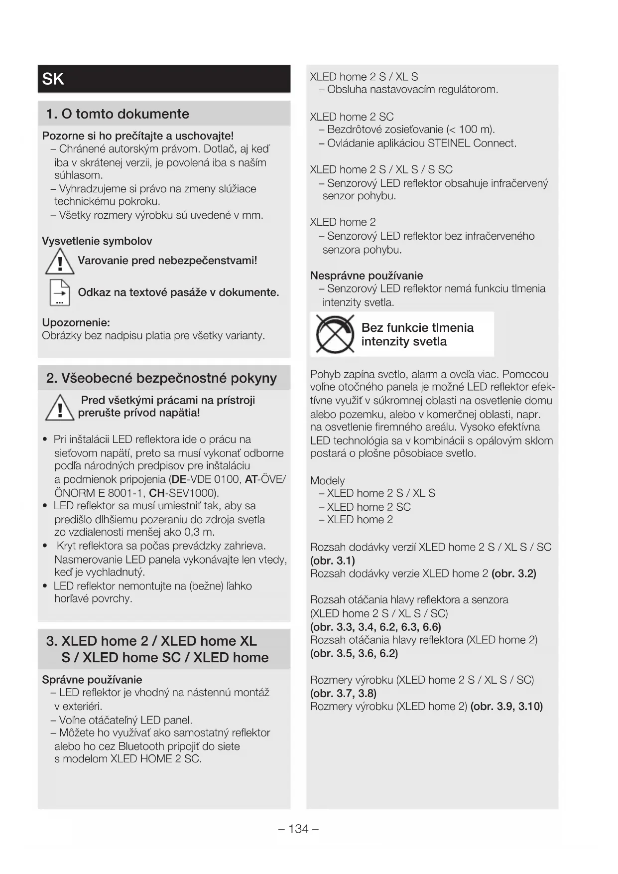 S/XLEDhome SC/XLEDhome Správne používanie – LED reflektor je vhodný na nástennú montáž v exteriéri. – Voľne otáčateľný LED panel. – Môžete ho využívať ako samostatný reflektor alebo ho cez Bluetooth pripojiť do siete smodelom XLEDHOME2SC. XLEDhome2 S/XL S – Obsluha nastavovacím regulátorom. XLEDhome2 SC – Bezdrôtové zosieťovanie (<100m). – Ovládanie aplikáciou STEINEL Connect. XLED home 2 S/XL S/S SC – Senzorový LED reflektor obsahuje infračervený senzor pohybu. XLED home 2 – Senzorový LED reflektor bez infračerveného senzora pohybu. Nesprávne používanie – Senzorový LED reflektor nemá funkciu tlmenia intenzity svetla. Bez funkcie tlmenia intenzity svetla Pohyb zapína svetlo, alarm a oveľa viac. Pomocou voľne otočného panela je možné LED reflektor efek- tívne využiť vsúkromnej oblasti na osvetlenie domu alebo pozemku, alebo vkomerčnej oblasti, napr. na osvetlenie firemného areálu. Vysoko efektívna LED technológia sa vkombinácii sopálovým sklom postará oplošne pôsobiace svetlo. Modely – XLEDhome2 S/XL S – XLEDhome2SC – XLEDhome2 Rozsah dodávky verzií XLED home 2 S/XL S/SC (obr.3.1) Rozsah dodávky verzie XLEDhome2 (obr.3.2) Rozsah otáčania hlavy reflektora asenzora (XLED home 2 S/XL S/SC) (obr.3.3, 3.4, 6.2, 6.3, 6.6) Rozsah otáčania hlavy reflektora (XLEDhome2) (obr.3.5, 3.6, 6.2) Rozmery výrobku (XLED home 2 S/XL S/SC) (obr.3.7, 3.8) Rozmery výrobku (XLEDhome2) (obr.3.9, 3.10)– 135 –