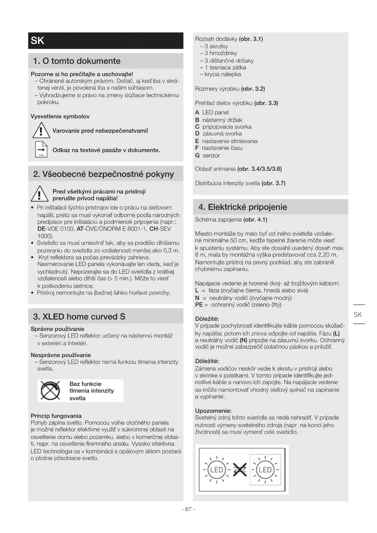 Varovanie pred nebezpečenstvami! Odkaz na textové pasáže vdokumente 2 Všeobecné bezpečnostné pokyny Pred všetkými prácami na prístroji prerušte prívod napätia! • Pri inštalácii týchto prístrojov ide o prácu na sieťovom napätí, preto sa musí vykonať odborne podľa národných predpisov pre inštaláciu a podmienok pripojenia (napr.: DE-VDE 0100, AT-ÖVE/ÖNORM E 8001-1, CH-SEV 1000).• Svietidlo sa musí umiestniť tak, aby sa predišlo dlhšiemu pozeraniu do svietidla zo vzdialenosti menšej ako 0,3m.• Kryt reflektora sa počas prevádzky zahrieva. Nasmerovanie LED panela vykonávajte len vtedy, keď je vychladnutý. Nepozerajte sa do LED svietidla zkrátkej vzdialenosti alebo dlhší čas (> 5 min.). Môže to viesť kpoškodeniu sietnice.• Prístroj nemontujte na (bežne) ľahko horľavé povrchy. 3 XLED home curved S Správne používanie – Senzorový LED reflektor určený na nástennú montáž vexteriéri a interiéri.Nesprávne používanie – Senzorový LED reflektor nemá funkciu tlmenia intenzity svetla.Bez funkcie tlmenia intenzity svetlaPrincíp fungovaniaPohyb zapína svetlo. Pomocou voľne otočného panela je možné reflektor efektívne využiť vsúkromnej oblasti na osvetlenie domu alebo pozemku, alebo vkomerčnej oblas-ti, napr. na osvetlenie firemného areálu. Vysoko efektívna LED technológia sa vkombinácii sopálovým sklom postará oplošne pôsobiace svetlo.