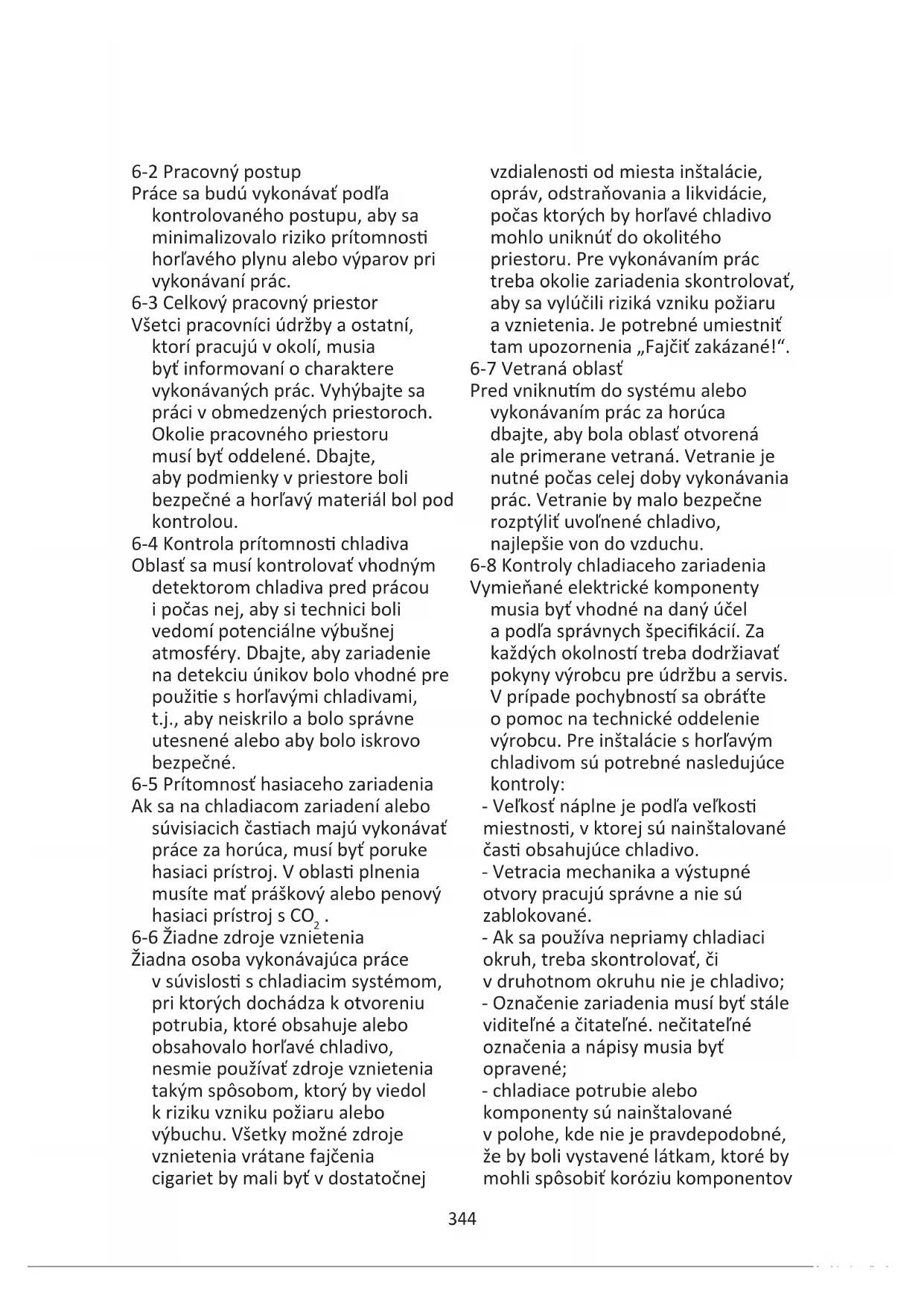 6-1 Kontroly priestoru Pred začiatkom práce na systéme, ktorý obsahuje horľavé chladivo, je potrebné vykonať bezpečnostné kontroly, aby sa minimalizovalo riziko vznietenia. Pri opravách chladiaceho systému je pred vykonávaním prác na systéme potrebné urobiť nasledujúce prevenvne opatrenia.344 6-2 Pracovný postup Práce sa budú vykonávať podľa kontrolovaného postupu, aby sa minimalizovalo riziko prítomnos horľavého plynu alebo výparov pri vykonávaní prác. 6-3 Celkový pracovný priestor Všetci pracovníci údržby a ostatní, ktorí pracujú v okolí, musia byť informovaní o charaktere vykonávaných prác. Vyhýbajte sa práci v obmedzených priestoroch. Okolie pracovného priestoru musí byť oddelené. Dbajte, aby podmienky v priestore boli bezpečné a horľavý materiál bol pod kontrolou. 6-4 Kontrola prítomnos chladiva Oblasť sa musí kontrolovať vhodným detektorom chladiva pred prácou i počas nej, aby si technici boli vedomí potenciálne výbušnej atmosféry. Dbajte, aby zariadenie na detekciu únikov bolo vhodné pre použie s horľavými chladivami, t.j., aby neiskrilo a bolo správne utesnené alebo aby bolo iskrovo bezpečné. 6-5 Prítomnosť hasiaceho zariadenia Ak sa na chladiacom zariadení alebo súvisiacich časach majú vykonávať práce za horúca, musí byť poruke hasiaci prístroj. V oblas plnenia musíte mať práškový alebo penový hasiaci prístroj s CO