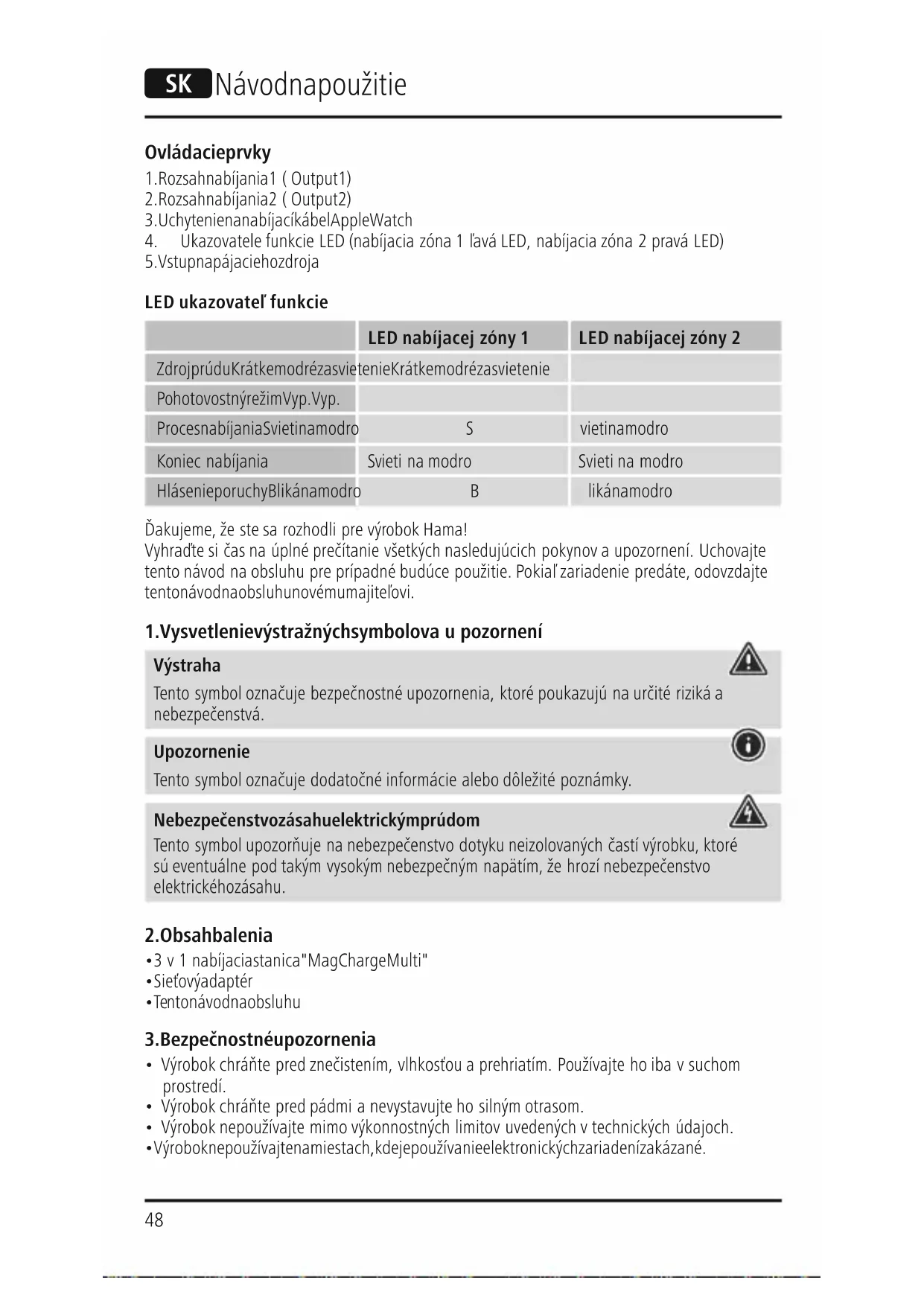LED ukazovateľ funkcie LED nabíjacej zóny 1LED nabíjacejzóny2 Zdroj prúdu Krátke modré zasvietenie Krátke modré zasvietenie Pohotovostný režim Vyp. Vyp. Proces nabíjania Svieti na modroSvieti na modro Koniec nabíjania Svieti na modroSvieti na modro Hlásenie poruchy Bliká na modroBliká na modro Ďakujeme, že ste sa rozhodli prevýrobok Hama! Vyhraďte si čas na úplné prečítanie všetkých nasledujúcich pokynov aupozornení. Uchovajte tento návod na obsluhu preprípadné budúce použitie. Pokiaľ zariadenie predáte, odovzdajte tento návod na obsluhu novému majiteľovi.