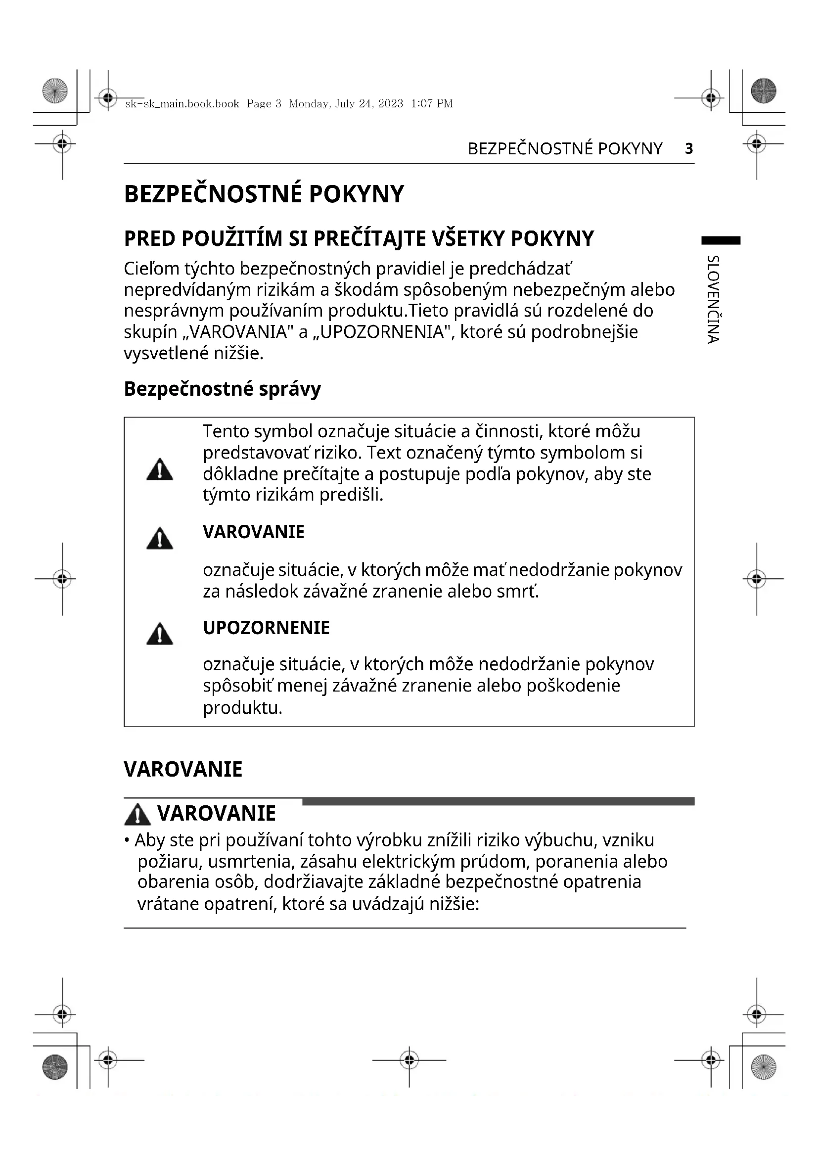 - Aby ste pri používaní tohto výrobku znížili riziko výbuchu, vzniku požiaru, usmrtenia, zásahu elektrickým prúdom, poranenia alebo obarenia osôb, dodržiavajte základné bezpečnostné opatrenia vrátane opatrení, ktoré sa uvádzajú nižšie: Tento symbol označuje situácie a činnosti, ktoré môžu predstavovať riziko. Text označený týmto symbolom si dôkladne prečítajte a postupuje podľa pokynov, aby ste týmto rizikám predišli. VAROVANIE označuje situácie, v ktorých môže mať nedodržanie pokynov za následok závažné zranenie alebo smrť. UPOZORNENIE označuje situácie, v ktorých môže nedodržanie pokynov spôsobiť menej závažné zranenie alebo poškodenie produktu. sk-sk_main.book.book Page 3 Monday, July 24, 2023 1:07 PM4