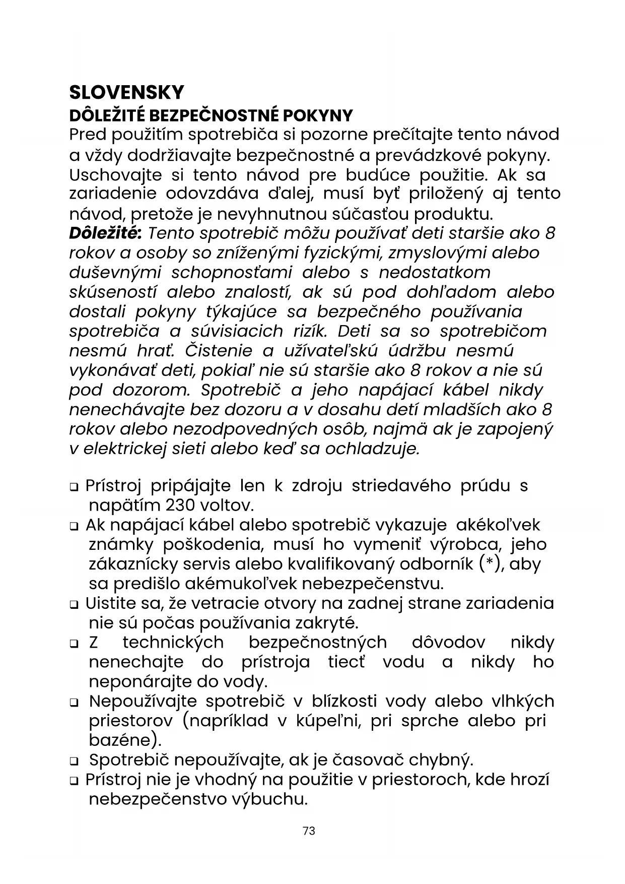 Pred použitím spotrebiča si pozorne prečítajte tento návod a vždy dodržiavajte bezpečnostné a prevádzkové pokyny. Uschovajte si tento návod pre budúce použitie. Ak sa zariadenie odovzdáva ďalej, musí byť priložený aj tento návod, pretože je nevyhnutnou súčasťou produktu. Dôležité: Tento spotrebič môžu používať deti staršie ako 8 rokov a osoby so zníženými fyzickými, zmyslovými alebo duševnými schopnosťami alebo s nedostatkom skúseností alebo znalostí, ak sú pod dohľadom alebo dostali pokyny týkajúce sa bezpečného používania spotrebiča a súvisiacich rizík. Deti sa so spotrebičom nesmú hrať. Čistenie a užívateľskú údržbu nesmú vykonávať deti, pokiaľ nie sú staršie ako 8 rokov a nie sú pod dozorom. Spotrebič a jeho napájací kábel nikdy nenechávajte bez dozoru a v dosahu detí mladších ako 8 rokov alebo nezodpovedných osôb, najmä ak je zapojený v elektrickej sieti alebo keď sa ochladzuje. ❑ Prístroj pripájajte len k zdroju striedavého prúdu s napätím 230 voltov. ❑ Ak napájací kábel alebo spotrebič vykazuje akékoľvek známky poškodenia, musí ho vymeniť výrobca, jeho zákaznícky servis alebo kvalifikovaný odborník (*), aby sa predišlo akémukoľvek nebezpečenstvu. ❑ Uistite sa, že vetracie otvory na zadnej strane zariadenia nie sú počas používania zakryté. ❑ Z technických bezpečnostných dôvodov nikdy nenechajte do prístroja tiecť vodu a nikdy ho neponárajte do vody. ❑ Nepoužívajte spotrebič v blízkosti vody alebo vlhkých priestorov (napríklad v kúpeľni, pri sprche alebo pri bazéne). ❑ Spotrebič nepoužívajte, ak je časovač chybný. ❑ Prístroj nie je vhodný na použitie v priestoroch, kde hrozí nebezpečenstvo výbuchu.74