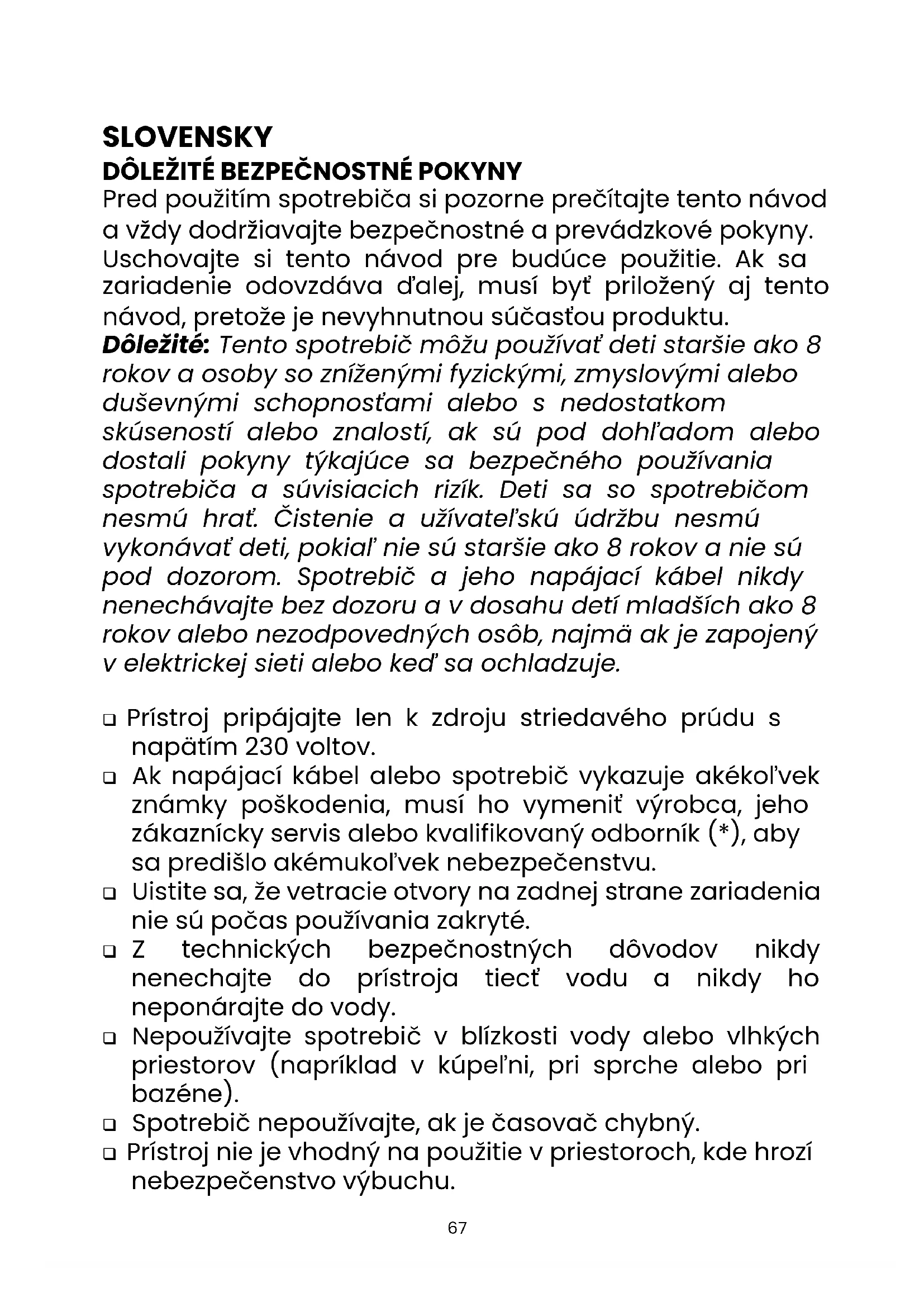 Pred použitím spotrebiča si pozorne prečítajte tento návod a vždy dodržiavajte bezpečnostné a prevádzkové pokyny. Uschovajte si tento návod pre budúce použitie. Ak sa zariadenie odovzdáva ďalej, musí byť priložený aj tento návod, pretože je nevyhnutnou súčasťou produktu. Dôležité: Tento spotrebič môžu používať deti staršie ako 8 rokov a osoby so zníženými fyzickými, zmyslovými alebo duševnými schopnosťami alebo s nedostatkom skúseností alebo znalostí, ak sú pod dohľadom alebo dostali pokyny týkajúce sa bezpečného používania spotrebiča a súvisiacich rizík. Deti sa so spotrebičom nesmú hrať. Čistenie a užívateľskú údržbu nesmú vykonávať deti, pokiaľ nie sú staršie ako 8 rokov a nie sú pod dozorom. Spotrebič a jeho napájací kábel nikdy nenechávajte bez dozoru a v dosahu detí mladších ako 8 rokov alebo nezodpovedných osôb, najmä ak je zapojený v elektrickej sieti alebo keď sa ochladzuje. ❑ Prístroj pripájajte len k zdroju striedavého prúdu s napätím 230 voltov. ❑ Ak napájací kábel alebo spotrebič vykazuje akékoľvek známky poškodenia, musí ho vymeniť výrobca, jeho zákaznícky servis alebo kvalifikovaný odborník (*), aby sa predišlo akémukoľvek nebezpečenstvu. ❑ Uistite sa, že vetracie otvory na zadnej strane zariadenia nie sú počas používania zakryté. ❑ Z technických bezpečnostných dôvodov nikdy nenechajte do prístroja tiecť vodu a nikdy ho neponárajte do vody. ❑ Nepoužívajte spotrebič v blízkosti vody alebo vlhkých priestorov (napríklad v kúpeľni, pri sprche alebo pri bazéne). ❑ Spotrebič nepoužívajte, ak je časovač chybný. ❑ Prístroj nie je vhodný na použitie v priestoroch, kde hrozí nebezpečenstvo výbuchu.68