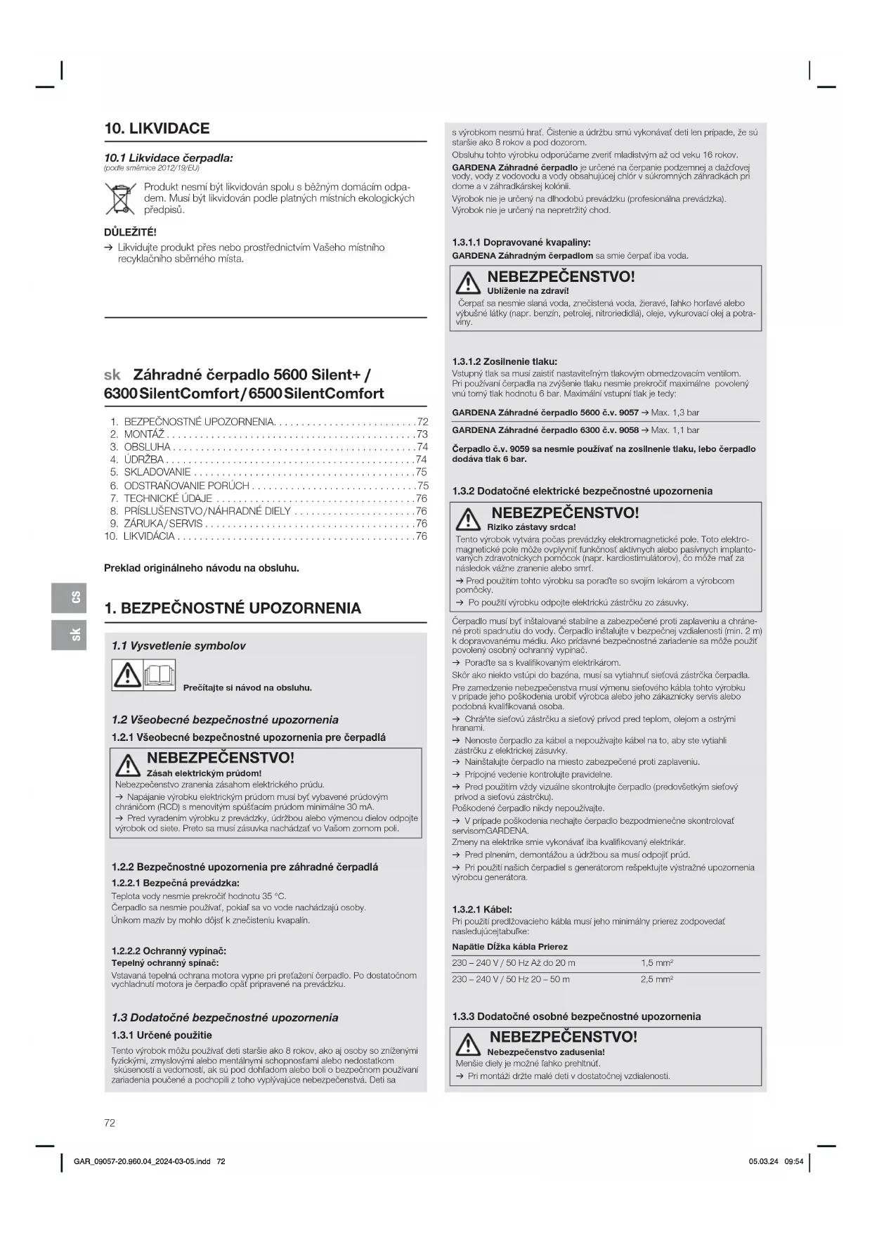 NEBEZPEČENSTVO! Riziko zástavy srdca!Tento výrobok vytvára počas prevádzky elektromagnetické pole. Toto elektro-magnetické pole môže ovplyvniť funkčnosť aktívnych alebo pasívnych implanto-vaných zdravotníckych pomôcok (napr. kardiostimulátorov), čo môže mať za následok vážne zranenie alebo smrť.v Pred použitím tohto výrobku sa poraďte so svojím lekárom avýrobcom pomôcky.v Po použití výrobku odpojte elektrickú zástrčku zo zásuvky.Čerpadlo musí byť inštalované stabilne a zabezpečené proti zaplaveniu a chráne-né proti spadnutiu do vody. Čerpadlo inštalujte v bezpečnej vzdialenosti (min. 2m) k dopravovanému médiu. Ako prídavné bezpečnostné zariadenie sa môže použiť povolený osobný ochranný vypínač.v Poraďte sa s kvalifikovaným elektrikárom.Skôr ako niekto vstúpi do bazéna, musí sa vytiahnuť sieťová zástrčka čerpadla.Pre zamedzenie nebezpečenstva musí výmenu sieťového kábla tohto výrobku vprípade jeho poškodenia urobiť výrobca alebo jeho zákaznícky servis alebo podobná kvalifikovaná osoba.v Chráňte sieťovú zástrčku a sieťový prívod pred teplom, olejom a ostrými hranami.v Nenoste čerpadlo za kábel a nepoužívajte kábel na to, aby ste vytiahli zástrčku z elektrickej zásuvky.v Nainštalujte čerpadlo na miesto zabezpečené proti zaplaveniu.v Prípojné vedenie kontrolujte pravidelne.v Pred použitím vždy vizuálne skontrolujte čerpadlo (predovšetkým sieťový prívod a sieťovú zástrčku).Poškodené čerpadlo nikdy nepoužívajte.v V prípade poškodenia nechajte čerpadlo bezpodmienečne skontrolovať servisom GARDENA.Zmeny na elektrike smie vykonávať iba kvalifikovaný elektrikár.v Pred plnením, demontážou a údržbou sa musí odpojiť prúd.v Pri použití našich čerpadiel s generátorom rešpektujte výstražné upozornenia výrobcu generátora.