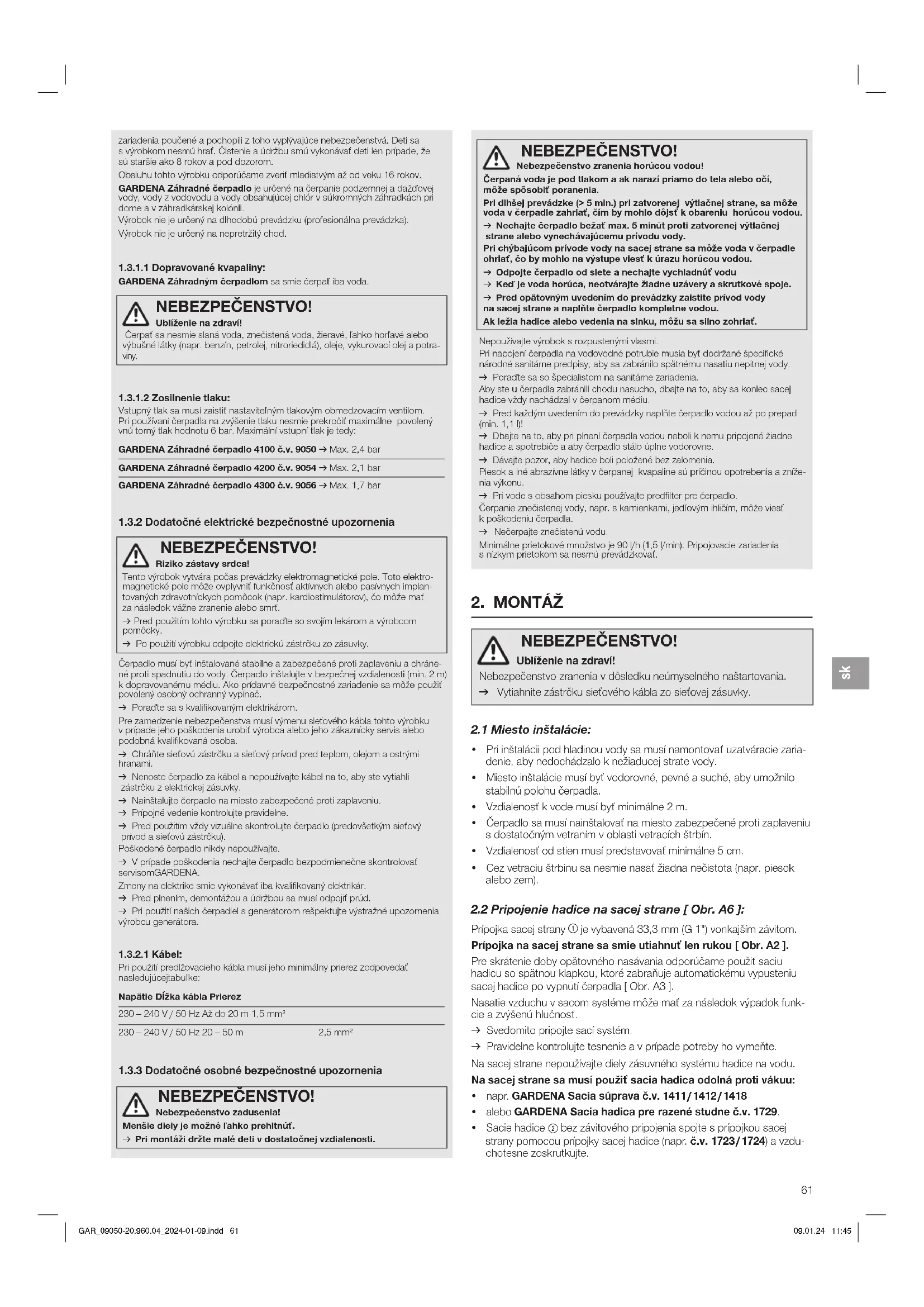 NEBEZPEČENSTVO! Riziko zástavy srdca!Tento výrobok vytvára počas prevádzky elektromagnetické pole. Toto elektro-magnetické pole môže ovplyvniť funkčnosť aktívnych alebo pasívnych implan-tovaných zdravotníckych pomôcok (napr. kardiostimulátorov), čo môže mať za následok vážne zranenie alebo smrť. v Pred použitím tohto výrobku sa poraďte so svojím lekárom avýrobcom pomôcky.v Po použití výrobku odpojte elektrickú zástrčku zo zásuvky.Čerpadlo musí byť inštalované stabilne a zabezpečené proti zaplaveniu a chráne-né proti spadnutiu do vody. Čerpadlo inštalujte v bezpečnej vzdialenosti (min. 2m) k dopravovanému médiu. Ako prídavné bezpečnostné zariadenie sa môže použiť povolený osobný ochranný vypínač.v Poraďte sa s kvalifikovaným elektrikárom.Pre zamedzenie nebezpečenstva musí výmenu sieťového kábla tohto výrobku vprípade jeho poškodenia urobiť výrobca alebo jeho zákaznícky servis alebo podobná kvalifikovaná osoba.v Chráňte sieťovú zástrčku a sieťový prívod pred teplom, olejom a ostrými hranami.v Nenoste čerpadlo za kábel a nepoužívajte kábel na to, aby ste vytiahli zástrčku z elektrickej zásuvky.v Nainštalujte čerpadlo na miesto zabezpečené proti zaplaveniu.v Prípojné vedenie kontrolujte pravidelne.v Pred použitím vždy vizuálne skontrolujte čerpadlo (predovšetkým sieťový prívod a sieťovú zástrčku).Poškodené čerpadlo nikdy nepoužívajte.v V prípade poškodenia nechajte čerpadlo bezpodmienečne skontrolovať servisom GARDENA.Zmeny na elektrike smie vykonávať iba kvalifikovaný elektrikár.v Pred plnením, demontážou a údržbou sa musí odpojiť prúd.v Pri použití našich čerpadiel s generátorom rešpektujte výstražné upozornenia výrobcu generátora.1.3.2.1 Kábel:Pri použití predlžovacieho kábla musí jeho minimálny prierez zodpovedať nasledujúcej tabuľke:Napätie Dĺžka kábla Prierez230 – 240 V / 50 Hz Až do 20 m 1,5 mm²230 – 240 V / 50 Hz 20 – 50 m 2,5 mm²