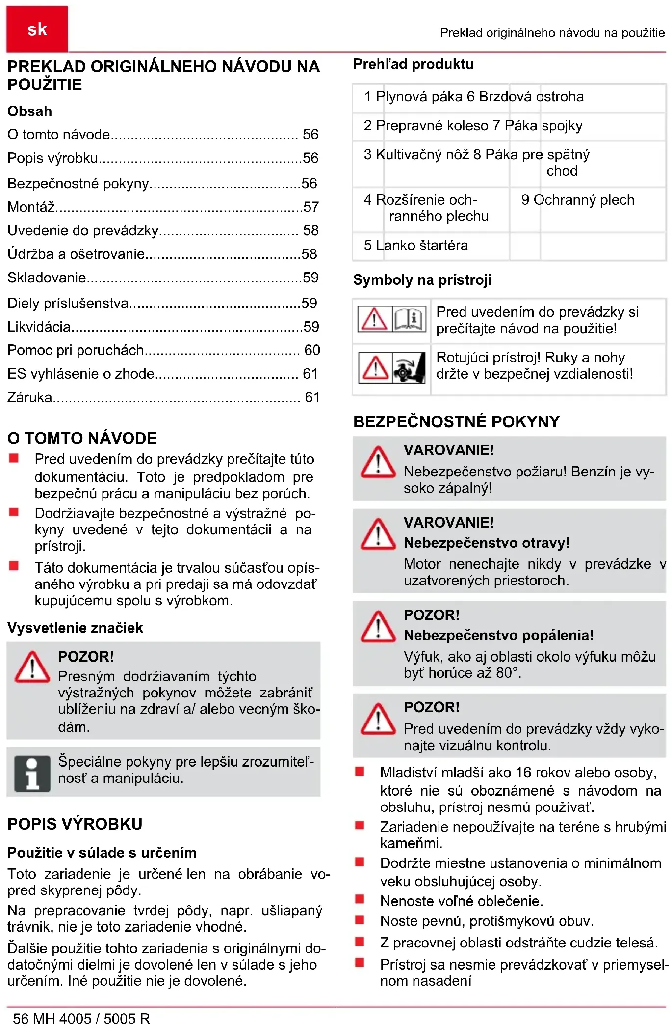 Použitie v súlade s určením Toto zariadenie je určené len na obrábanie vo- pred skyprenej pôdy. Na prepracovanie tvrdej pôdy, napr. ušliapaný trávnik, nie je toto zariadenie vhodné. Ďalšie použitie tohto zariadenia s originálnymi do- datočnými dielmi je dovolené len v súlade s jeho určením. Iné použitie nie je dovolené. Prehľad produktu 1 Plynová páka 6 Brzdová ostroha 2 Prepravné koleso 7 Páka spojky 3 Kultivačný nôž 8 Páka pre spätný chod 4 Rozšírenie och- ranného plechu 9 Ochranný plech 5 Lanko štartéra Symboly na prístroji Pred uvedením do prevádzky si prečítajte návod na použitie! Rotujúci prístroj! Ruky a nohy držte v bezpečnej vzdialenosti!