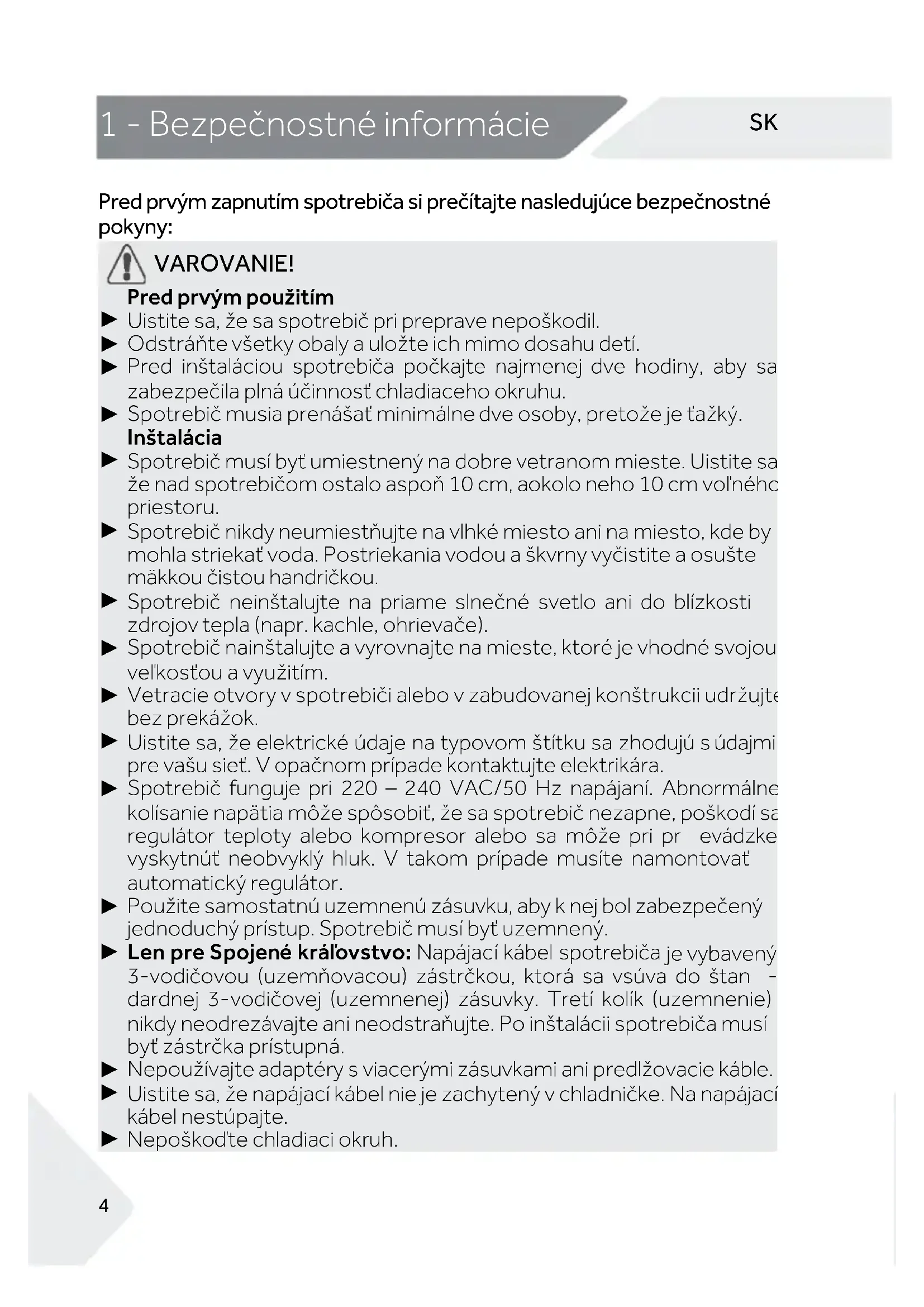 Bezpeč nos tné info rm áci e Pred prvým zapnutím spotrebiča si prečítajte nasledujúce bezpečnostné pokyny: