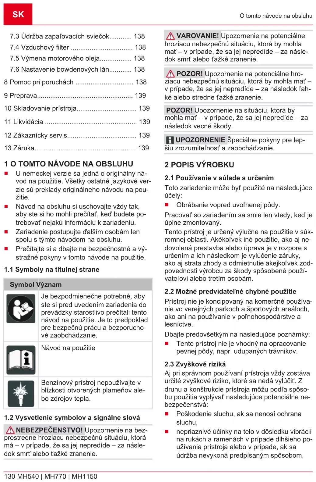 ho alebo motorového oleja: Dolejte olej. Prevodový olej pozri Kapitola 7.2 "Dolievanie alebo výmena pre- vodového oleja MH770, MH1150 (38)", stra- na138 Motorový olej UPOZORNENIE Podrobné informácie náj- dete v samostatnom návode na obsluhu motora. 6 OBSLUHA VAROVANIE! Nebezpečenstvo poranenia uvoľnenými časťami prístroja. Časti prístroja, ktoré sa počas prevádzky uvoľnia, môžu spôsobiť vážne zranenia.