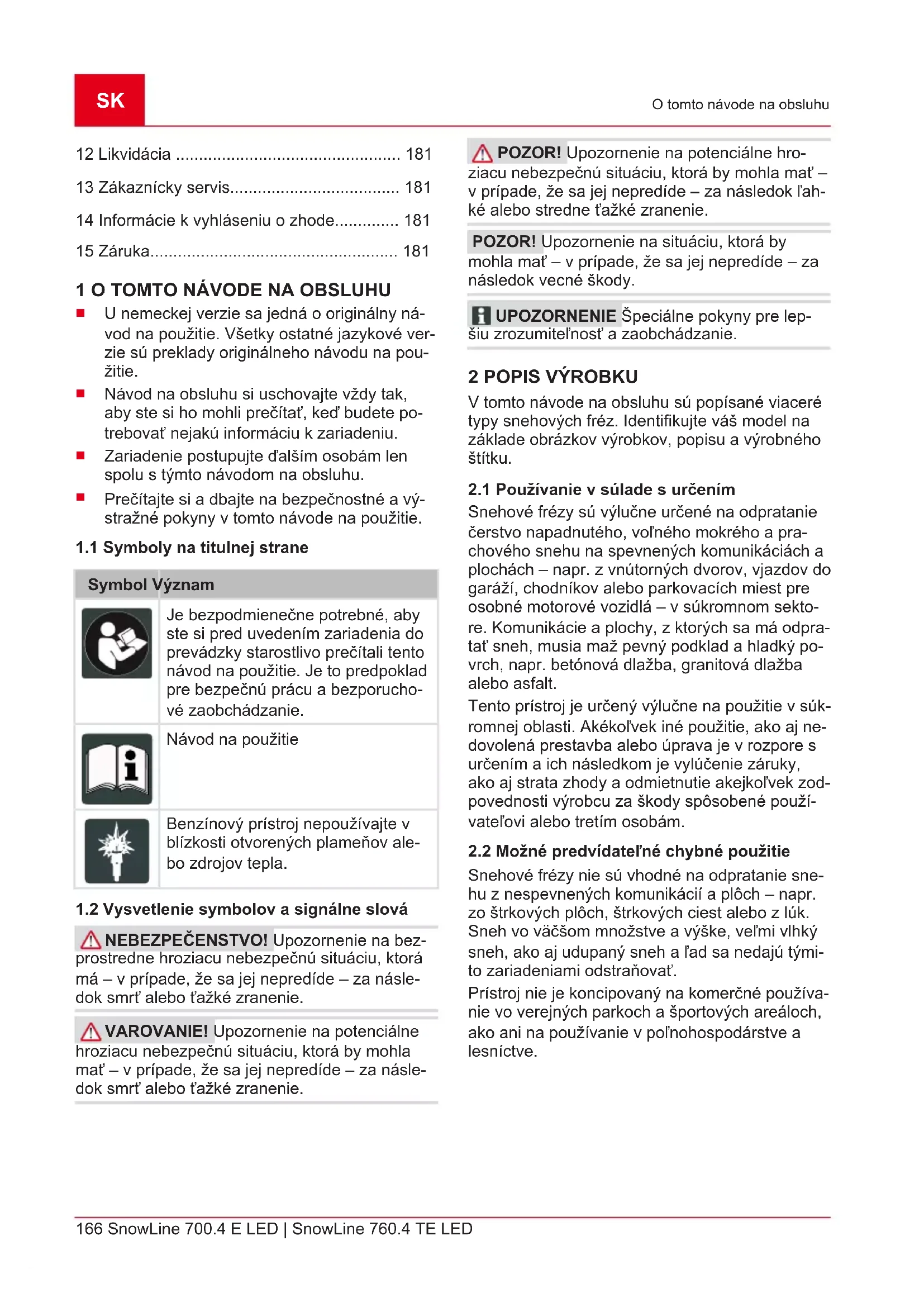 Symbol Význam Pozor! Buďte mimoriadne opatrní pri mani- pulácii! Pred uvedením do prevádzky si prečítajte návod na použitie! Zdržiavajte sa mimo oblasti vyha- dzovania. Nebezpečenstvo spôso- bené vyhadzovačom snehu. Noste ochranu očí a sluchu! Nesiahajte do rotujúcich častí. Ne- bezpečenstvo vtiahnutia!SK 168 SnowLine 700.4 E LED | SnowLine 760.4 TE LED Popis výrobku Symbol Význam Nesiahajte do vyhadzovača snehu! Nesiahajte alebo nevstupujte do zá- vitovky! Pred všetkými prácami na zariadení vypnite motor. Pred prácami údržby a opravami vytiahnite konektor zapaľovacej sviečky. Tretie osoby nepúšťajte do nebez- pečnej oblasti! Rotujúce časti v oblasti vyhadzova- ča! Nebezpečenstvo vtiahnutia!