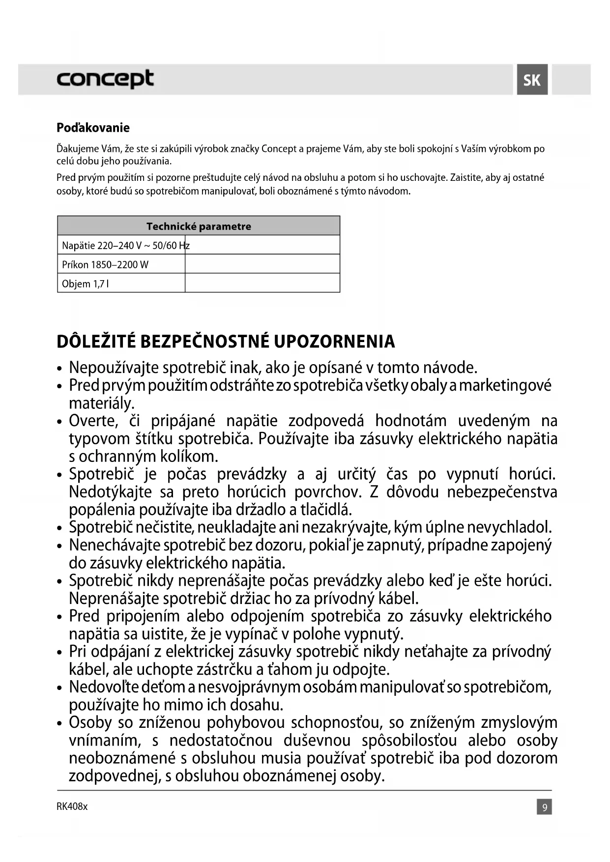 Poďakovanie Ďakujeme Vám, že ste si zakúpili výrobok značky Concept a prajeme Vám, aby ste boli spokojní s Vaším výrobkom po celú dobu jeho používania. Pred prvým použitím si pozorne preštudujte celý návod na obsluhu a potom si ho uschovajte. Zaistite, aby aj ostatné osoby, ktoré budú so spotrebičom manipulovať, boli oboznámené s týmto návodom. Technické parametre Napätie 220–240 V ~ 50/60 Hz Príkon 1850–2200 W Objem 1,7 l
