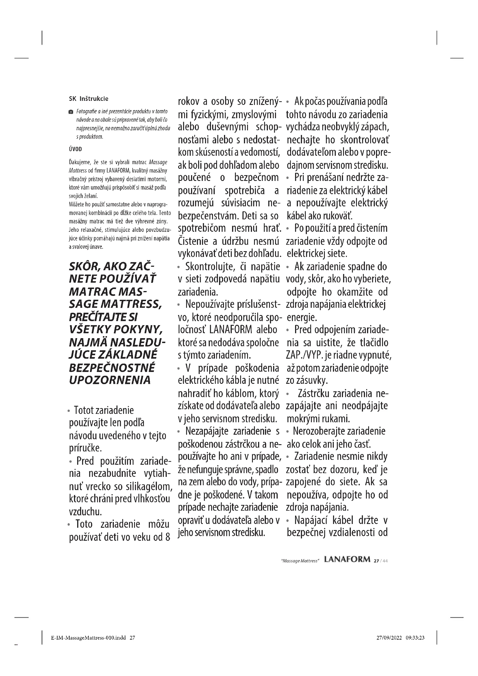 E-IM-MassageMattress-010.indd 26E-IM-MassageMattress-010.indd 26 27/09/2022 09:33:2327/09/2022 09:33:23“Massage Mattress” 27 / 44 SK Inštrukcie Fotograe a iné prezentácie produktu v tomto návode a na obale sú pripravené tak, aby boli čo najpresnejšie, no nemožno zaručiť úplnú zhodu s produktom. ÚVOD Ďakujeme, že ste si vybrali matrac Massage Mattress od rmy LANAFORM, kvalitný masážny vibračný prístroj vybavený desiatimi motormi, ktoré vám umožňujú prispôsobiť si masáž podľa svojich želaní. Môžete ho použiť samostatne alebo v naprogra- movanej kombinácii po dĺžke celého tela. Tento masážny matrac má tiež dve výhrevné zóny. Jeho relaxačné, stimulujúce alebo povzbudzu