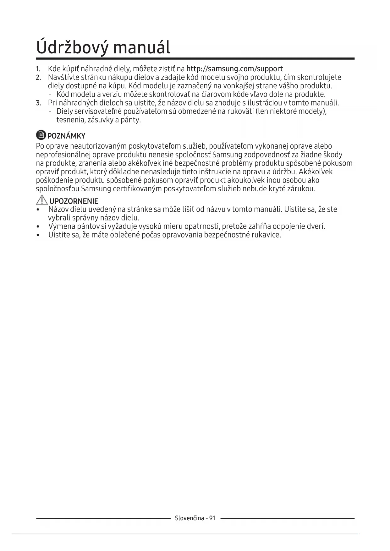 ‐ Diely servisovateľné používateľom sú obmedzené na rukoväti (len niektoré modely), tesnenia, zásuvky a pánty. POZNÁMKY Po oprave neautorizovaným poskytovateľom služieb, používateľom vykonanej oprave alebo neprofesionálnej oprave produktu nenesie spoločnosť Samsung zodpovednosť za žiadne škody naprodukte, zranenia alebo akékoľvek iné bezpečnostné problémy produktu spôsobené pokusom opraviť produkt, ktorý dôkladne nenasleduje tieto inštrukcie na opravu a údržbu. Akékoľvek poškodenie produktu spôsobené pokusom opraviť produkt akoukoľvek inou osobou ako spoločnosťou Samsung certifikovaným poskytovateľom služieb nebude kryté zárukou. UPOZORNENIE