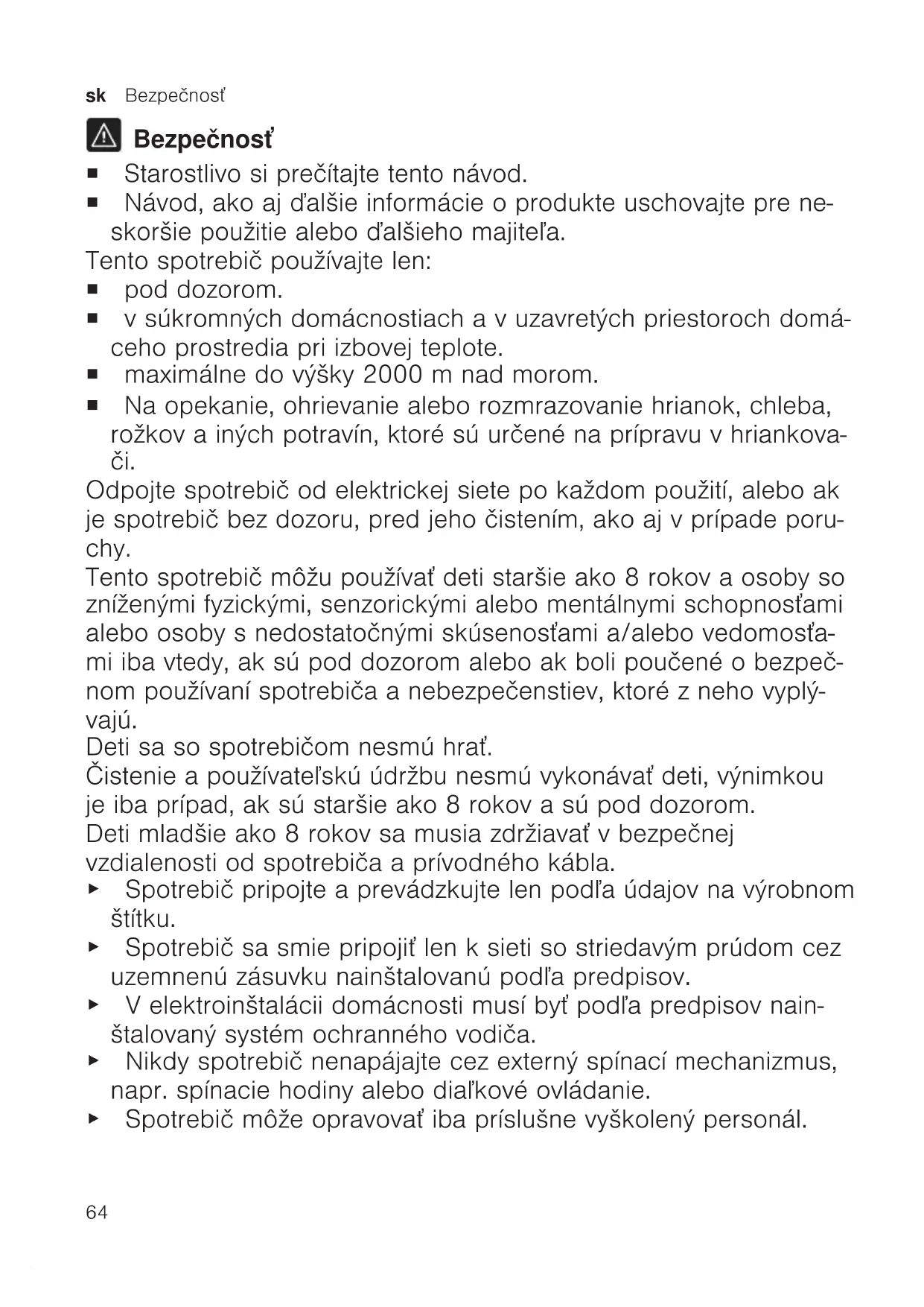 Bezpečnosť ¡ Starostlivo si prečítajte tento návod. ¡ Návod, ako aj ďalšie informácie oprodukte uschovajte pre ne- skoršie použitie alebo ďalšieho majiteľa. Tento spotrebič používajte len: ¡ pod dozorom. ¡ vsúkromných domácnostiach avuzavretých priestoroch domá- ceho prostredia pri izbovej teplote. ¡ maximálne do výšky 2000m nad morom. ¡ Na opekanie, ohrievanie alebo rozmrazovanie hrianok, chleba, rožkov a iných potravín, ktoré sú určené na prípravu v hriankova- či. Odpojte spotrebič od elektrickej siete po každom použití, alebo ak je spotrebič bez dozoru, pred jeho čistením, ako aj vprípade poru- chy. Tento spotrebič môžu používať deti staršie ako 8rokov aosoby so zníženými fyzickými, senzorickými alebo mentálnymi schopnosťami alebo osoby snedostatočnými skúsenosťami a/alebo vedomosťa- mi iba vtedy, ak sú pod dozorom alebo ak boli poučené obezpeč- nom používaní spotrebiča anebezpečenstiev, ktoré zneho vyplý- vajú. Deti sa so spotrebičom nesmú hrať. Čistenie apoužívateľskú údržbu nesmú vykonávať deti, výnimkou je iba prípad, ak sú staršie ako 8rokov asú pod dozorom. Deti mladšie ako 8 rokov sa musia zdržiavať vbezpečnej vzdialenosti od spotrebiča aprívodného kábla. ▶ Spotrebič pripojte aprevádzkujte len podľa údajov na výrobnom štítku. ▶ Spotrebič sa smie pripojiť len ksieti so striedavým prúdom cez uzemnenú zásuvku nainštalovanú podľa predpisov. ▶ Velektroinštalácii domácnosti musí byť podľa predpisov nain- štalovaný systém ochranného vodiča. ▶ Nikdy spotrebič nenapájajte cez externý spínací mechanizmus, napr. spínacie hodiny alebo diaľkové ovládanie. ▶ Spotrebič môže opravovať iba príslušne vyškolený personál.Bezpečnosť sk