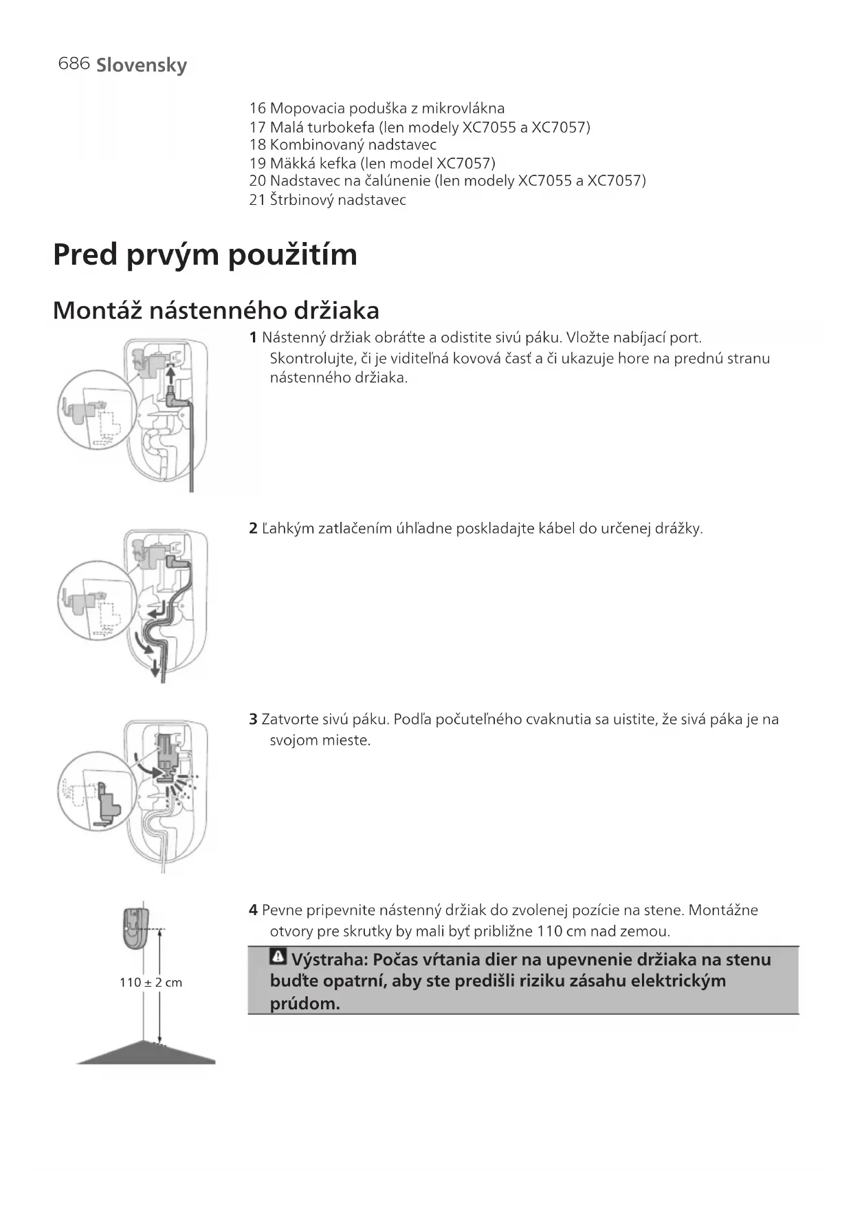Slovensky Obsah Úvod _____________________________________________________________________________________ 685 Opis zariadenia ____________________________________________________________________________ 685 Pred prvým použitím________________________________________________________________________ 686 Montáž nástenného držiaka _________________________________________________________________ 686 Príprava na použitie ________________________________________________________________________ 687 Používanie zariadenia_______________________________________________________________________ 688 Zostavenie prístroja_________________________________________________________________________ 688 Vysávanie mäkkých atvrdých podláh _________________________________________________________ 689 Vysávanie smokrým čistením tvrdých podláh __________________________________________________ 690 Univerzálne použitie apríslušenstvo __________________________________________________________ 693 Prispôsobenie adodatočné informácie ________________________________________________________ 696 Po použití– údržba _________________________________________________________________________ 698 Častá údržba po každom cykle čistenia________________________________________________________ 698 Pravidelná údržba vintervaloch ______________________________________________________________ 701 Výmena___________________________________________________________________________________ 707 Signály v používateľskom rozhraní a ich význam ________________________________________________ 708 Riešenie problémov ________________________________________________________________________ 710 Suché čistenie _____________________________________________________________________________ 710 Mokré čistenie _____________________________________________________________________________ 714 Úvod Ďakujeme za zakúpenie tohto produktu. Ak chcete plne využívať výhody zákazníckej podpory, ktoré ponúkame, zaregistrujte si produkt na adrese www.philips.com/mycordlessvacuum-7000s. Opis zariadenia 1 Digitálny displej a Kruhový indikátor úrovne nabitia batérie b Percento úrovne nabitia batérie c Vybraná úroveň výkonu d Ikona aktivácie funkcie rozpoznania typu podlahy e Ikona pripomenutia čistenia filtra 2 Tlačidlo ponuky/potvrdenia 3 Tlačidlo + 4 Tlačidlo– 5 Tlačidlo zap./vyp. 6 Ručný vysávač 7 Nádoba na prach 8 Batéria 9 Filter navyše (len model XC7057) 10 Tlačidlo na uvoľnenie nádoby na prach 11 Nástenný držiak 12 Adaptér 13 Trubica 14 Inteligentná hubica PrecisionPower 15 Nádoba na vodu686 Slovensky 16 Mopovacia poduška zmikrovlákna 17 Malá turbokefa (len modely XC7055 aXC7057) 18 Kombinovaný nadstavec 19 Mäkká kefka (len model XC7057) 20 Nadstavec na čalúnenie (len modely XC7055 aXC7057) 21 Štrbinový nadstavec Pred prvým použitím Montáž nástenného držiaka 1 Nástenný držiak obráťte aodistite sivú páku. Vložte nabíjací port. Skontrolujte, či je viditeľná kovová časť ači ukazuje hore na prednú stranu nástenného držiaka. 2 Ľahkým zatlačením úhľadne poskladajte kábel do určenej drážky. 3 Zatvorte sivú páku. Podľa počuteľného cvaknutia sa uistite, že sivá páka je na svojom mieste. 110 ± 2 cm 4 Pevne pripevnite nástenný držiak do zvolenej pozície na stene. Montážne otvory pre skrutky by mali byť približne 110cm nad zemou. Výstraha: Počas vŕtania dier naupevnenie držiaka na stenu buďte opatrní, aby ste predišli riziku zásahu elektrickým prúdom.687 Slovensky Poznámka: Skontrolujte, že umiestnenie nástenného držiaka je zvolené tak, že môže celý prístroj visieť na stene bez toho, aby sa hubicou dotýkal podlahy. 5 Keď určíte optimálne umiestnenie avýšku pre skladovanie anabíjanie prístroja, pevne skrutky utiahnite, aby bol nástenný držiak riadne upevnený. Príprava na použitie Zariadenie je vybavené lítium-iónovou batériou. Nabíjanie vybitej batérie na plné nabitie trvá asi 6hodín. 1 Pripojte batériu do tela prístroja. Podľa počuteľného cvaknutia sa uistite, že je riadne pripojená. MAX 40⁰C MIN 5⁰C 2 Prístroj nabíjajte tak, že ho umiestnite do namontovaného nástenného držiaka. Varovanie: Prístroj skladujte anabíjajte pri teplote vyššej než 5°C anižšej než 40°C.688 Slovensky Poznámka: Tiež môžete položiť ručný vysávač na rovný astabilný povrch azapojiť nabíjací kábel priamo do prístroja.
