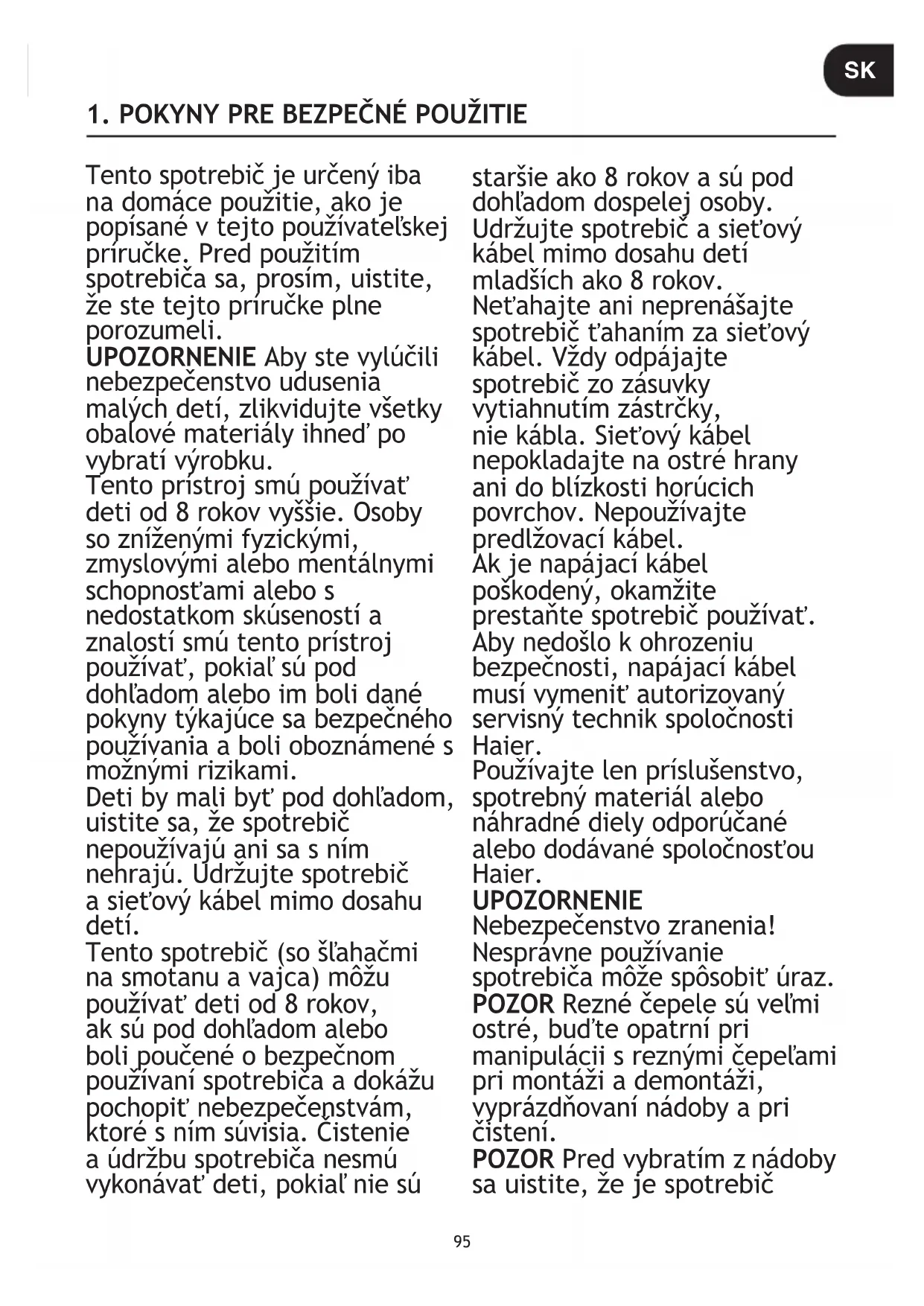 a domáce použitie, ako je popísané v tejto používateľskej príručke. Pred použitím spotrebiča sa, prosím, uistite, že ste tejto príručke plne porozumeli. UPOZORNENIE Aby ste vylúčili nebezpečenstvo udusenia malých detí, zlikvidujte všetky obalové materiály ihneď po vybratí výrobku. Tento prístroj smú používať deti od 8 rokov vyššie. Osoby so zníženými fyzickými, zmyslovými alebo mentálnymi schopnosťami alebo s nedostatkom skúseností a znalostí smú tento prístroj používať, pokiaľ sú pod dohľadom alebo im boli dané pokyny týkajúce sa bezpečného používania a boli oboznámené s možnými rizikami. Deti by mali byť pod dohľadom, uistite sa, že spotrebič nepoužívajú ani sa s ním nehrajú. Udržujte spotrebič a sieťový kábel mimo dosahu detí. Tento spotrebič (so šľahačmi na smotanu a vajca) môžu používať deti od 8 rokov, ak sú pod dohľadom alebo boli poučené o bezpečnom používaní spotrebiča a dokážu pochopiť nebezpečenstvám, ktoré s ním súvisia. Čistenie a údržbu spotrebiča nesmú vykonávať deti, pokiaľ nie sú staršie ako 8 rokov a sú pod dohľadom dospelej osoby. Udržujte spotrebič a sieťový kábel mimo dosahu detí mladších ako 8 rokov. Neťahajte ani neprenášajte spotrebič ťahaním za sieťový kábel. Vždy odpájajte spotrebič zo zásuvky vytiahnutím zástrčky, nie kábla. Sieťový kábel nepokladajte na ostré hrany ani do blízkosti horúcich povrchov. Nepoužívajte predlžovací kábel. Ak je napájací kábel poškodený, okamžite prestaňte spotrebič používať. Aby nedošlo k ohrozeniu bezpečnosti, napájací kábel musí vymeniť autorizovaný servisný technik spoločnosti Haier. Používajte len príslušenstvo, spotrebný materiál alebo náhradné diely odporúčané alebo dodávané spoločnosťou Haier. UPOZORNENIE Nebezpečenstvo zranenia! Nesprávne používanie spotrebiča môže spôsobiť úraz. POZOR Rezné čepele sú veľmi ostré, buďte opatrní pri manipulácii s reznými čepeľami pri montáži a demontáži, vyprázdňovaní nádoby a pri čistení. POZOR Pred vybratím z nádoby sa uistite, že je spotrebič