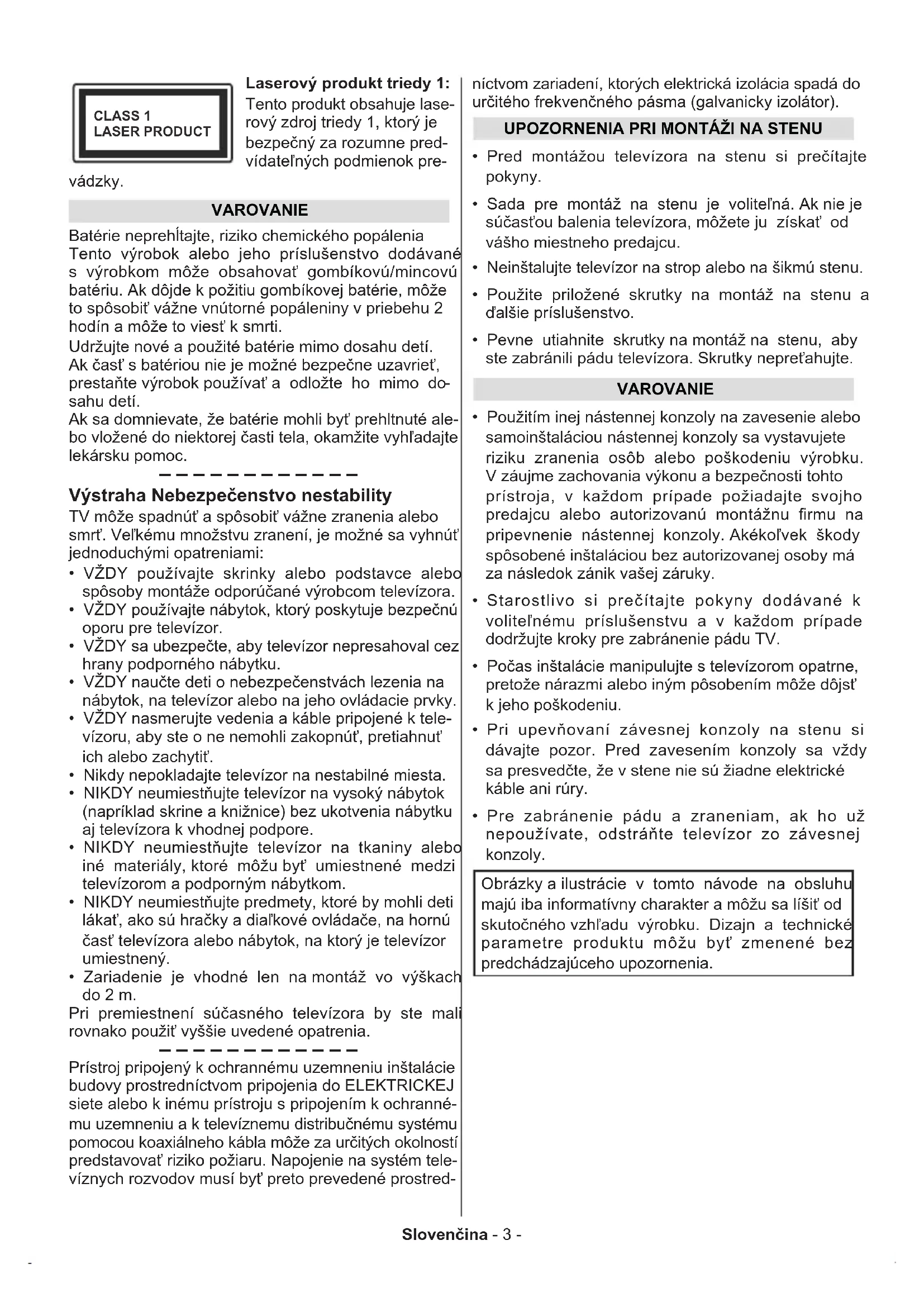 sahu detí. Ak sa domnievate, že batérie mohli byť prehltnuté ale- bo vložené do niektorej časti tela, okamžite vyhľadajte lekársku pomoc. – – – – – – – – – – – – Výstraha Nebezpečenstvo nestability TV môže spadnúť a spôsobiť vážne zranenia alebo smrť. Veľkému množstvu zranení, je možné sa vyhnúť jednoduchými opatreniami: