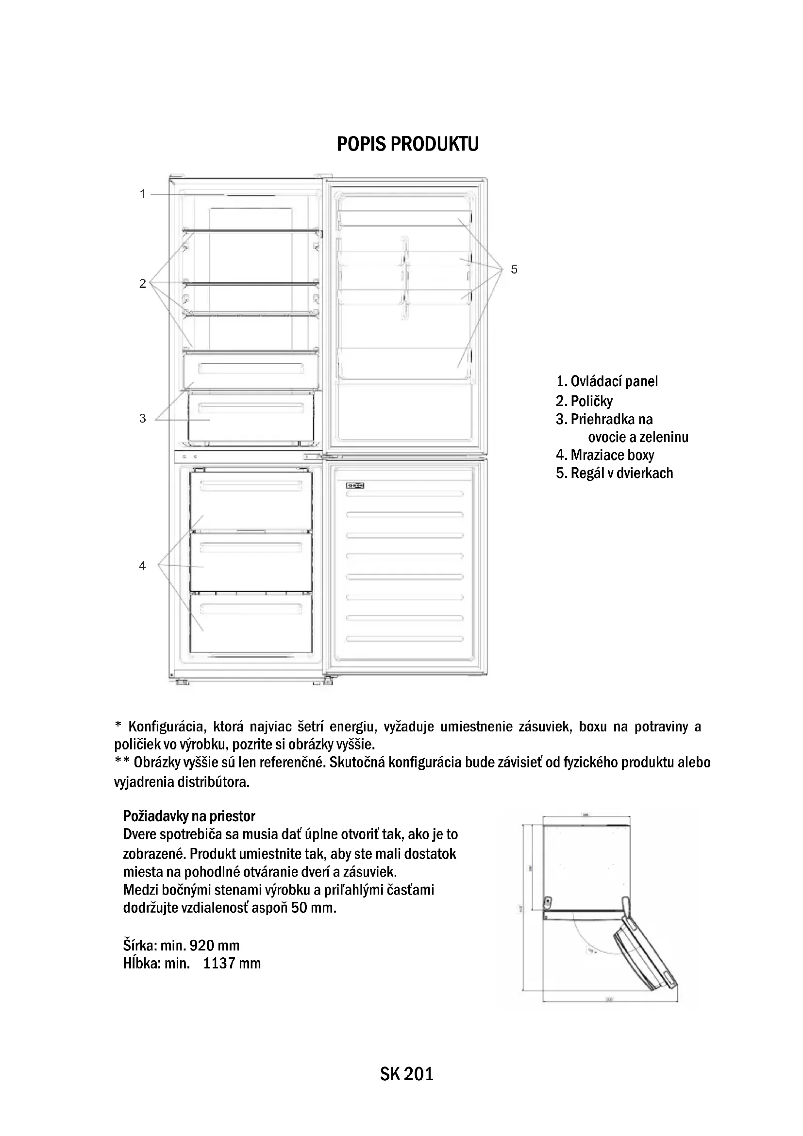 Požiadavky na priestor Dvere spotrebiča sa musia dať úplne otvoriť tak, ako je to zobrazené. Produkt umiestnite tak, aby ste mali dostatok miesta na pohodlné otváranie dverí a zásuviek. Medzi bočnými stenami výrobku a priľahlými časťami dodržujte vzdialenosť aspoň 50 mm. Šírka: min. 920 mm Hĺbka: min. 1137 mmSK 202 POUŽITIE A. Vypínač sa používa na zapnutie/vypnutie spotrebiča B. Tlačidlo Wi-Fi sa používa na zapnutie/vypnutie Wi-Fi C. Tlačidlo Mode sa používa na výber požadovanej funkcie D. Tlačidlo teploty sa používa na výber teploty v chladničke a mrazničke a. Ikona oblasti chladničky/mrazničky zobrazuje, ktoré oddelenie spotrebiča je vybrané b. Ikona Super Freeze zobrazuje, či je aktivovaná funkcia Super Freeze c. Úrovne teploty mrazničky ukazujú, aká teplota je zvolená pre priestor mrazenia d. Ikona Super Cool zobrazuje, či je aktivovaná funkcia Super Cool e. Úrovne teploty chladničky ukazujú, aká teplota je zvolená pre priestor chladenia f. Ikona prispôsobenej teploty zobrazuje, či bola teplota vybraná aplikáciou g. Ikona ekonomického režimu zobrazuje, či je aktivovaný ekologický režim h. Ikona funkcie Holiday zobrazuje, či je aktivovaná funkcia Holiday