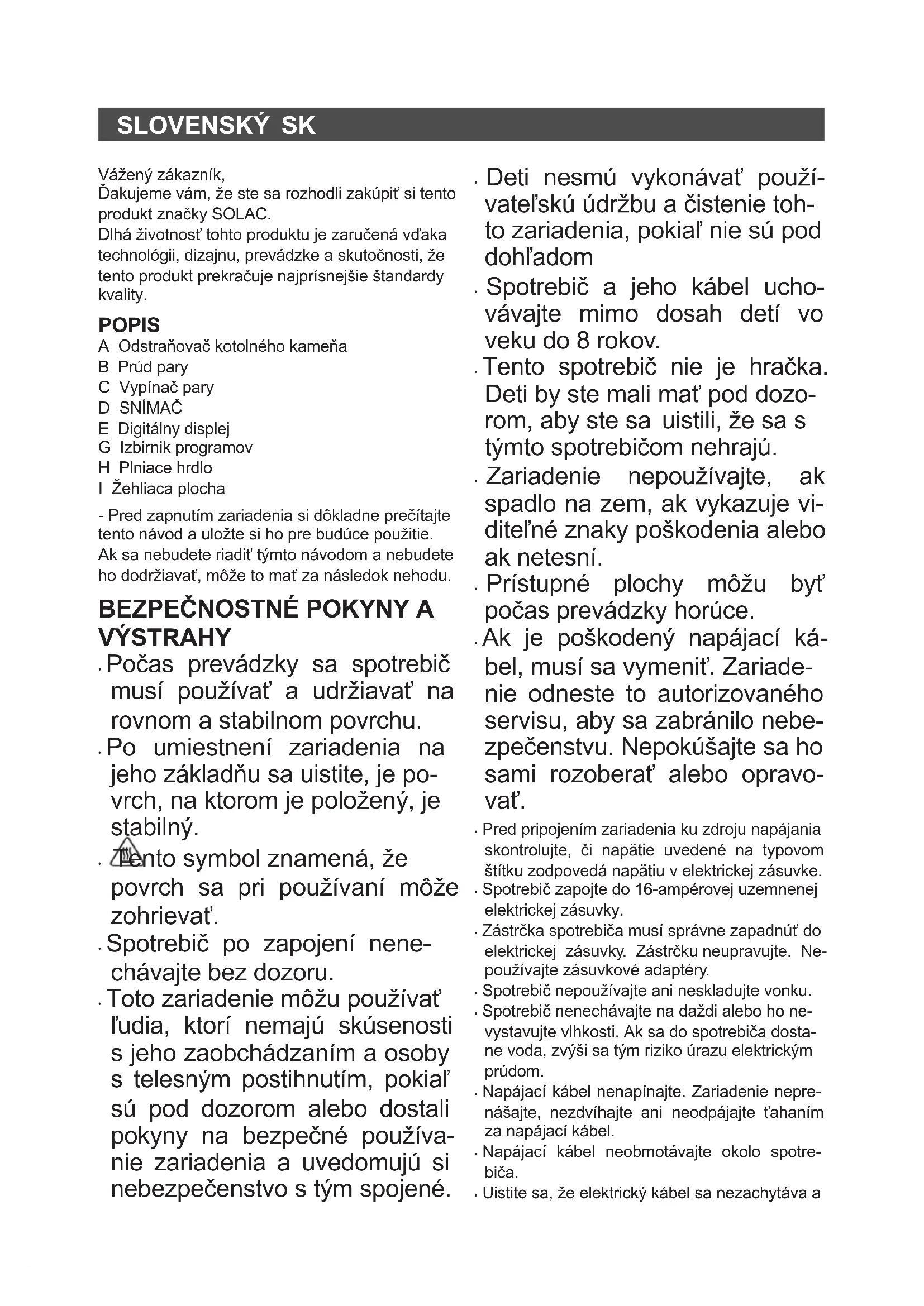 E Digitálny displej G Izbirnik programov H Plniace hrdlo I Žehliaca plocha - Pred zapnutím zariadenia si dôkladne prečítajte tento návod a uložte si ho pre budúce použitie. Ak sa nebudete riadiť týmto návodom a nebudete ho dodržiavať, môže to mať za následok nehodu.