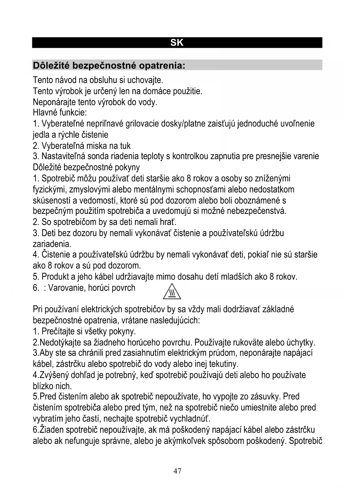 2. Nedotýkajte sa žiadneho horúceho povrchu. Používajte rukoväte alebo úchytky.