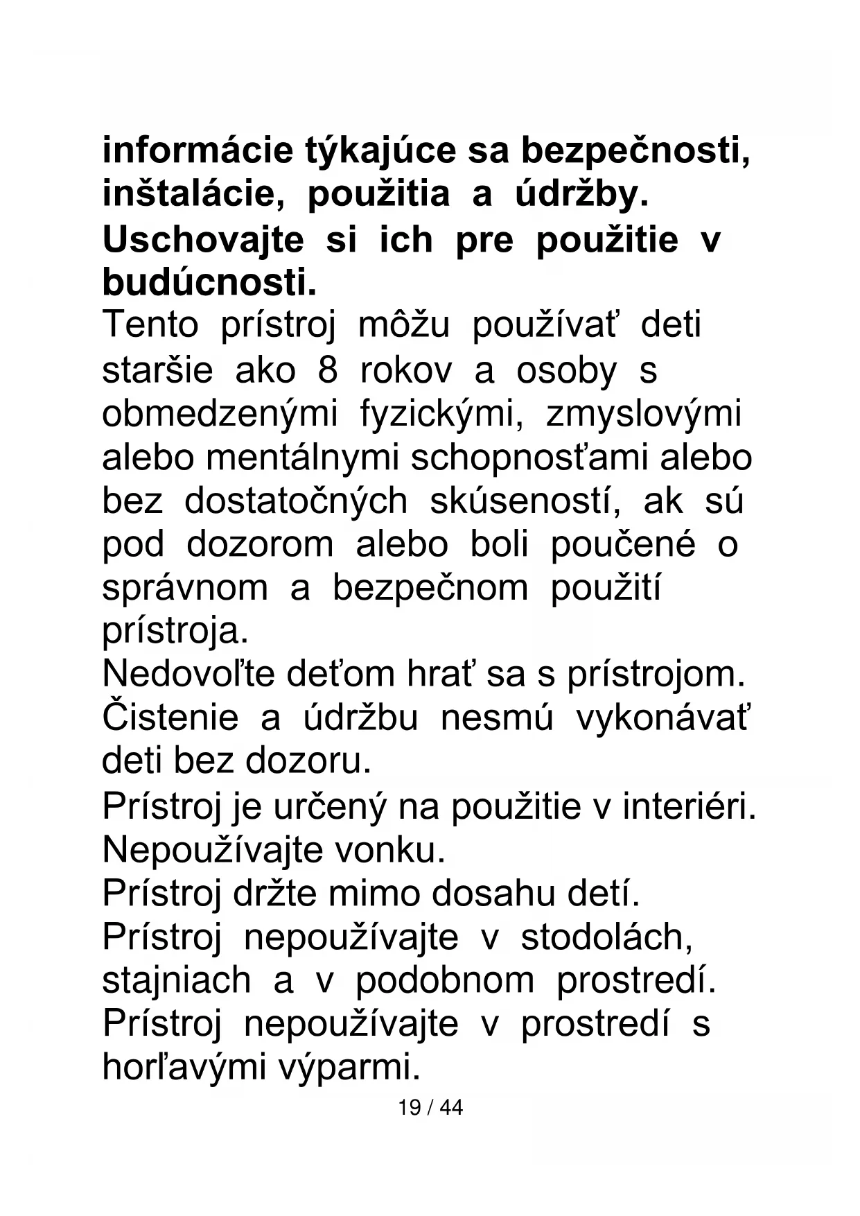 (SK) VAROVANIE Pozor: dôkladne si prečítajte tieto pokyny, pretože obsahujú dôležité19 / 44 informácie týkajúce sa bezpečnosti, inštalácie, použitia a údržby. Uschovajte si ich pre použitie v budúcnosti. Tento prístroj môžu používať deti staršie ako 8 rokov a osoby s obmedzenými fyzickými, zmyslovými alebo mentálnymi schopnosťami alebo bez dostatočných skúseností, ak sú pod dozorom alebo boli poučené o správnom a bezpečnom použití prístroja. Nedovoľte deťom hrať sa s prístrojom. Čistenie a údržbu nesmú vykonávať deti bez dozoru. Prístroj je určený na použitie v interiéri. Nepoužívajte vonku. Prístroj držte mimo dosahu detí. Prístroj nepoužívajte v stodolách, stajniach a v podobnom prostredí. Prístroj nepoužívajte v prostredí s horľavými výparmi.20 / 44 Komponenty tohto prístroja môže meniť len kvalifikovaný technik servisného strediska. Poškodený prívodný kábel môže meniť len autorizované servisné stredisko schválené výrobcom.