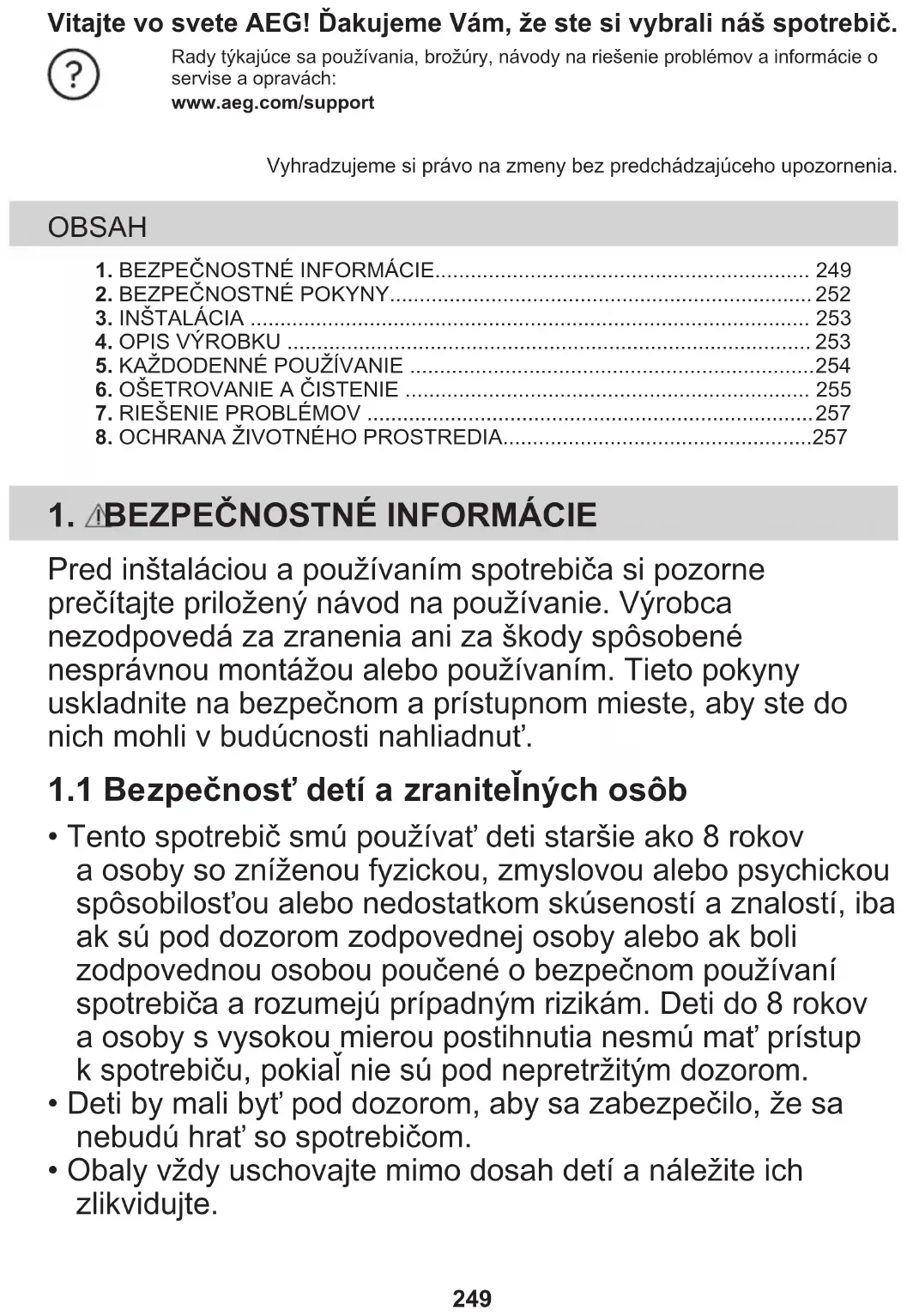 - Tento spotrebič smú používať deti staršie ako 8 rokov a osoby so zníženou fyzickou, zmyslovou alebo psychickou spôsobilosťou alebo nedostatkom skúseností a znalostí, iba ak sú pod dozorom zodpovednej osoby alebo ak boli zodpovednou osobou poučené o bezpečnom používaní spotrebiča a rozumejú prípadným rizikám. Deti do 8 rokov a osoby s vysokou mierou postihnutia nesmú mať prístup k spotrebiču, pokiaľ nie sú pod nepretržitým dozorom.