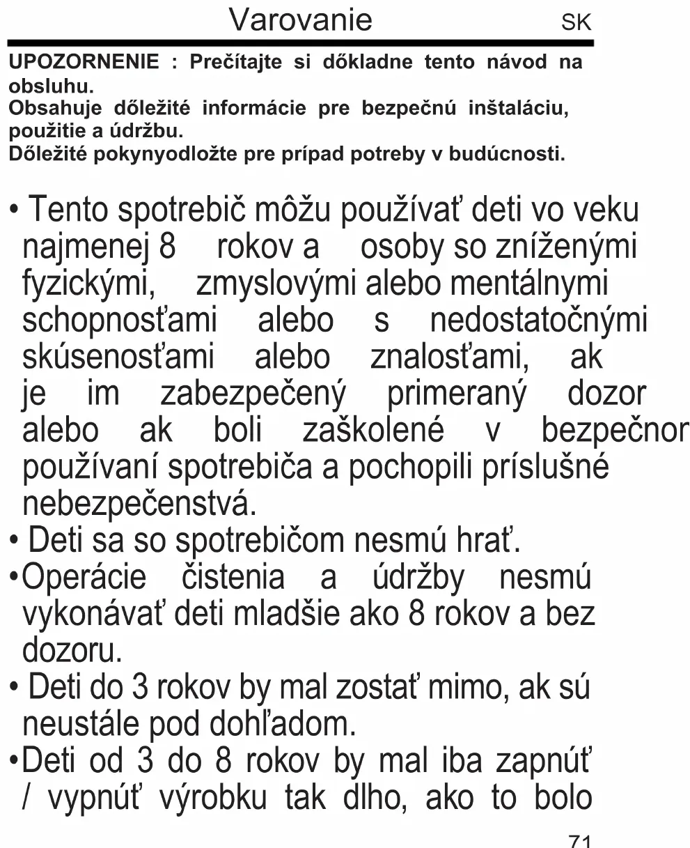 - Deti od 3 do 8 rokov by malibazapnúť / vypnúť výrobku tak dlho, ako to bolo Varovanie72 umiestnenéalebopoinštaláciivnormálnej prevádzkovejpolohe,aksúpoddohľadom alebo ak sa dostali pokyny týkajúce sa bezpečnéhopoužívaniavýrobku,achápu nebezpečenstvo.