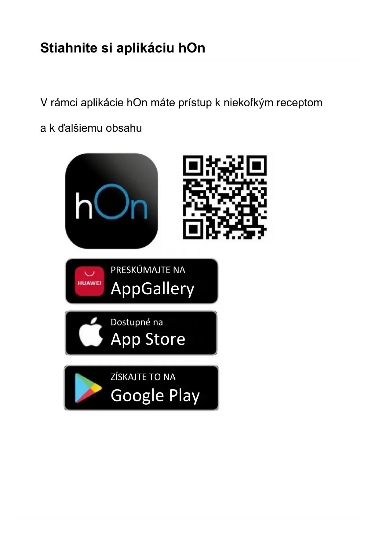 L-N:220-240V ~ L1-L2:380-415V ~Stiahnite si aplikáciu hOn V rámci aplikácie hOn máte prístup k niekoľkým receptom a k ďalšiemu obsahu